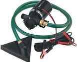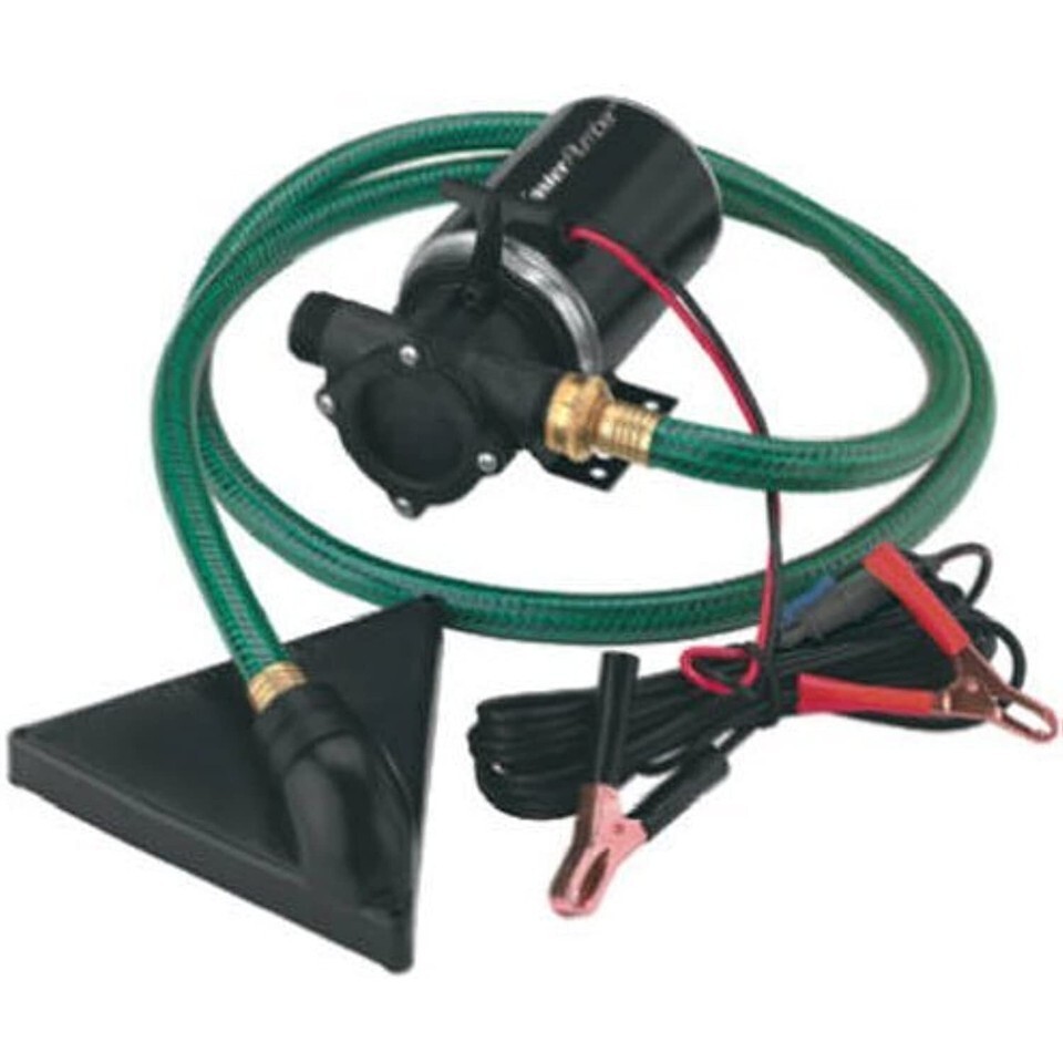 Master plumber, 12V, pud-l-scoop, mini portable utility pump, 6' suction hose, bonus impeller kit, 10' leads batter clamps Garden hose fittings, performance: gph at 0' = 450' 5' = 435, 10' = 390, 20' = 300, 30' = 225, 40' = 130. 1 year warranty.