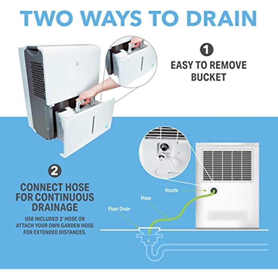 SAFE EFFICIENT WATER REMOVAL: Enjoy peace of mind with our continuous drainage option. Simply run a garden hose (not included) to any nearby floor drain for easy, no maintenance moisture removal. Otherwise use the easy to empty bucket if a floor drain is not available. Includes a convenient indicator light as well as the added safety of automatic shut-off when the water bucket is full. Designed to improve your indoor air quality easily and quickly.