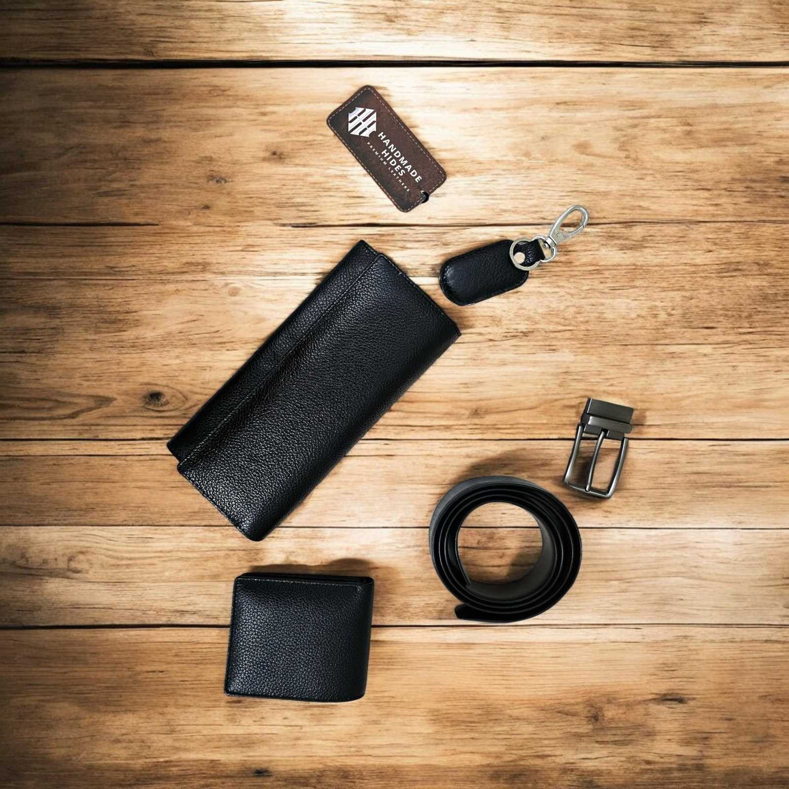 Designed to impress, the set includes a spacious large wallet with multiple compartments, zip pockets, and card slots to keep everything organized, and a compact wallet ideal for daily errands or quick trips. The reversible leather belt offers versatile wear, seamlessly matching any wardrobe, while the sleek keyring adds a touch of class to his keys.