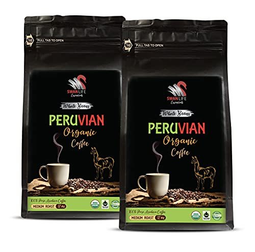 peruvian coffee beans whole - ORGANIC PERUVIAN WHOLE BEANS COFFEE, Medium Roast, 100% Arabica, Fair Trade, non gmo - peruvian products food, organic coffee from peru, by SWAN LIFE ESSENTIALS - (24 Ounce 2 Bags)