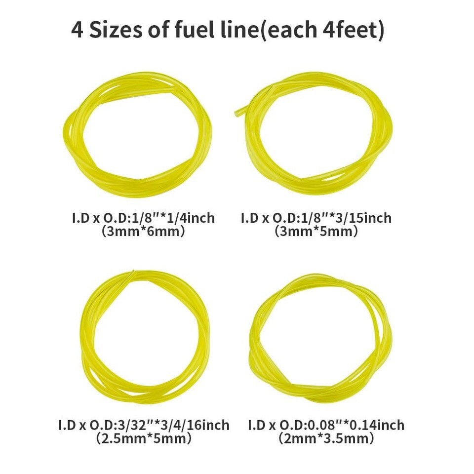 4 Size 4-feet Fuel Line I.D. x O.D.: 3/32" x 3/16", 1/8" x 3/16", 1/8" x 1/4", .080" x .140" for chainsaw string trimmer weed eater carburetor small engine gas fuel line; Resists swelling and hardening, including low temperature