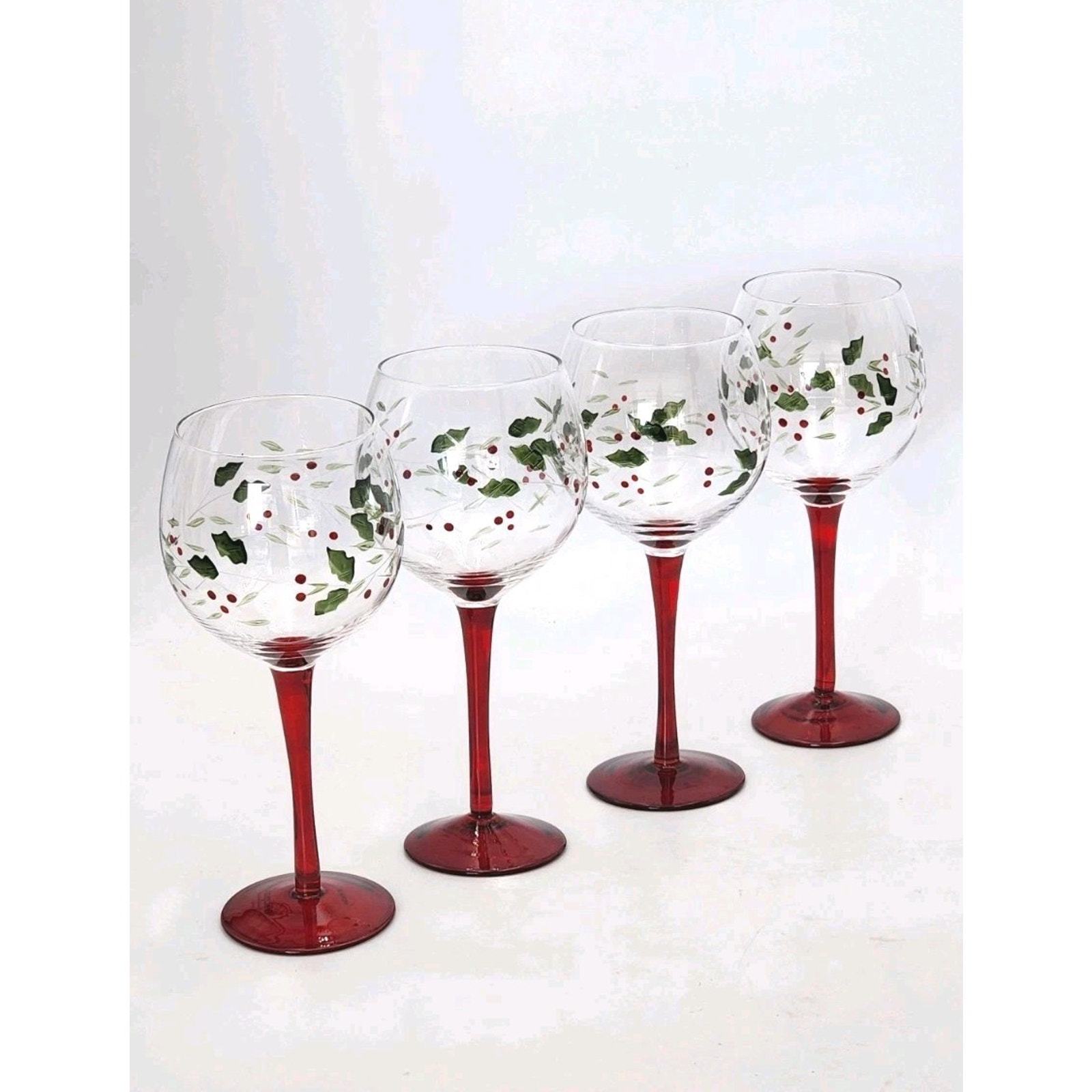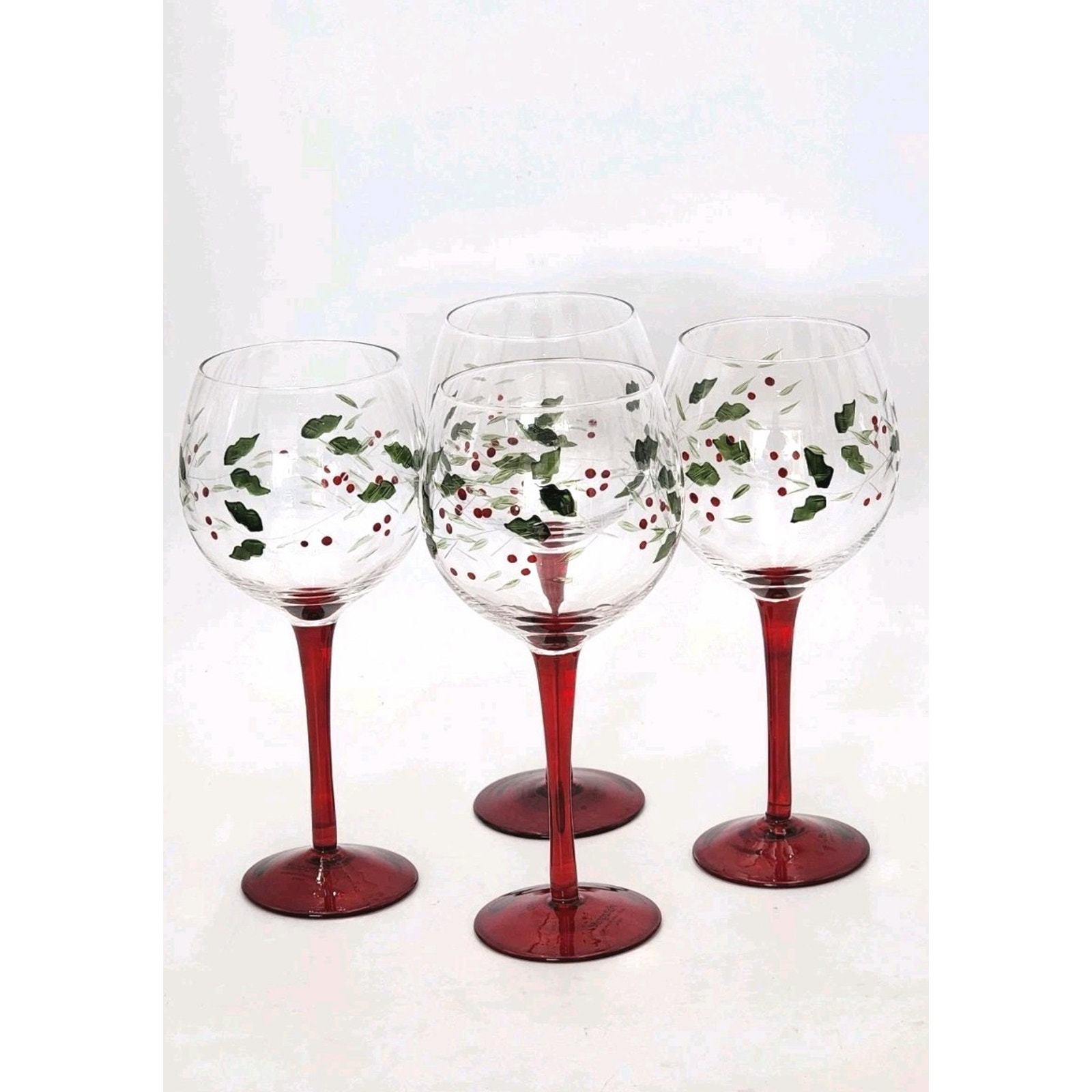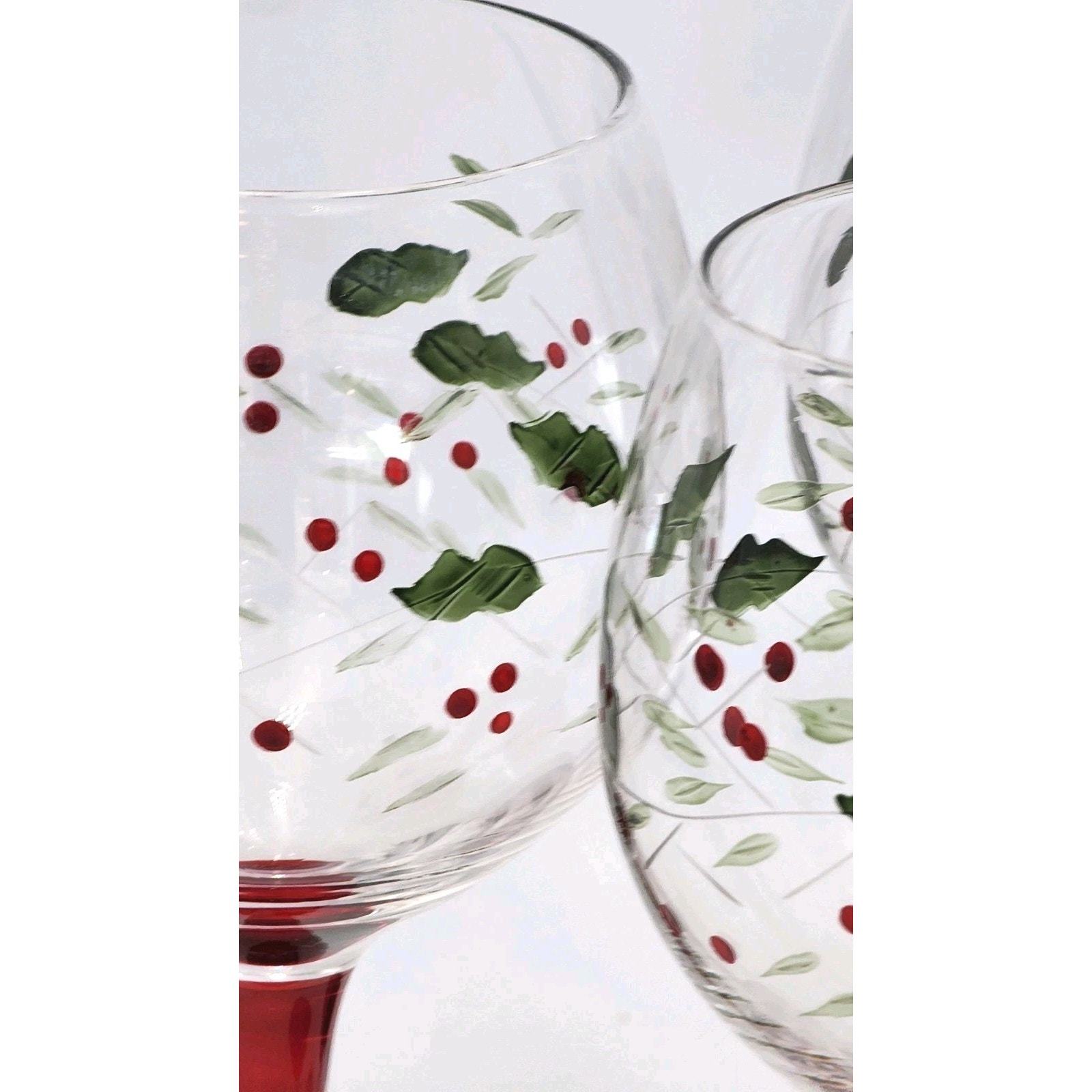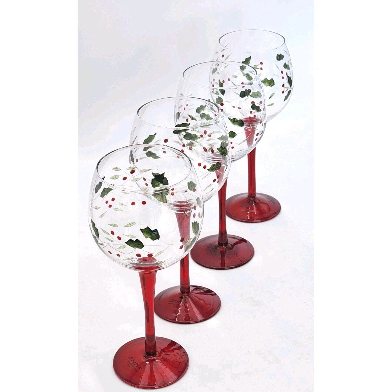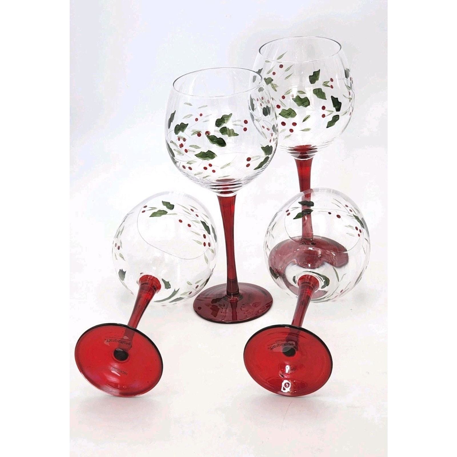 - Pfaltzgraff Winterberry Wine Goblet Set Of 4 Etched and Handed Painted Holly Red