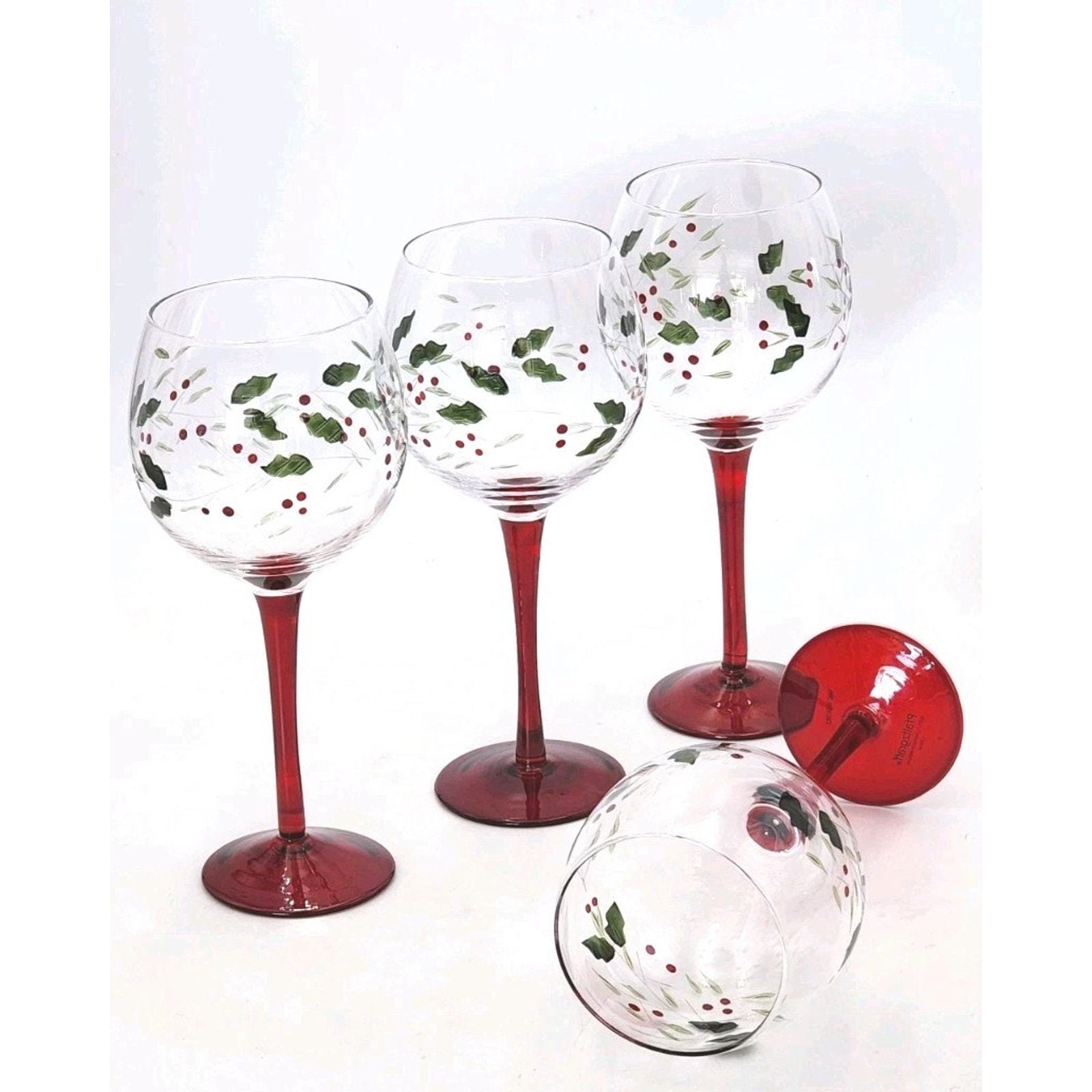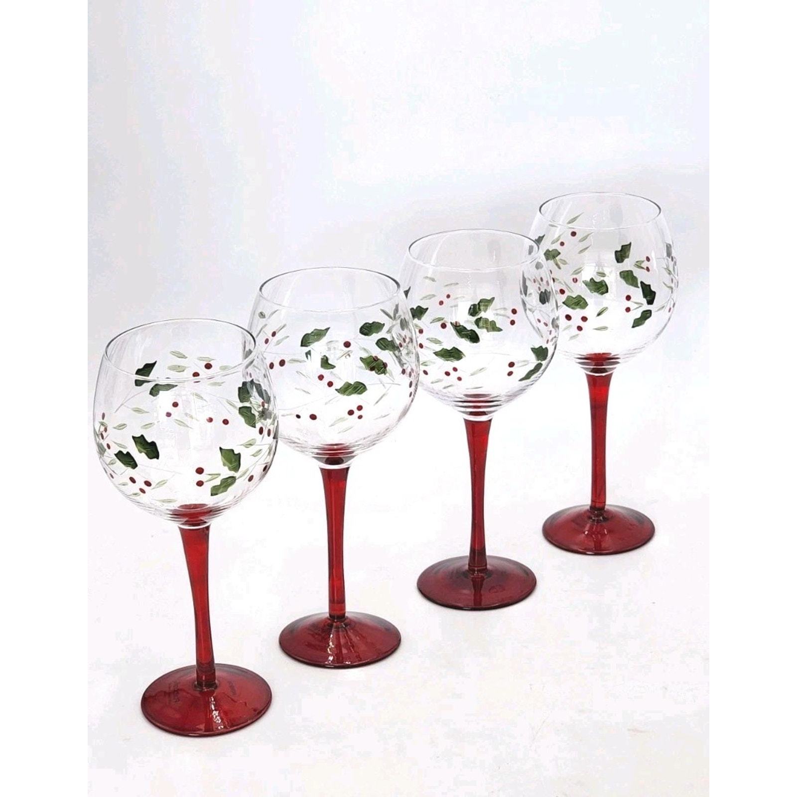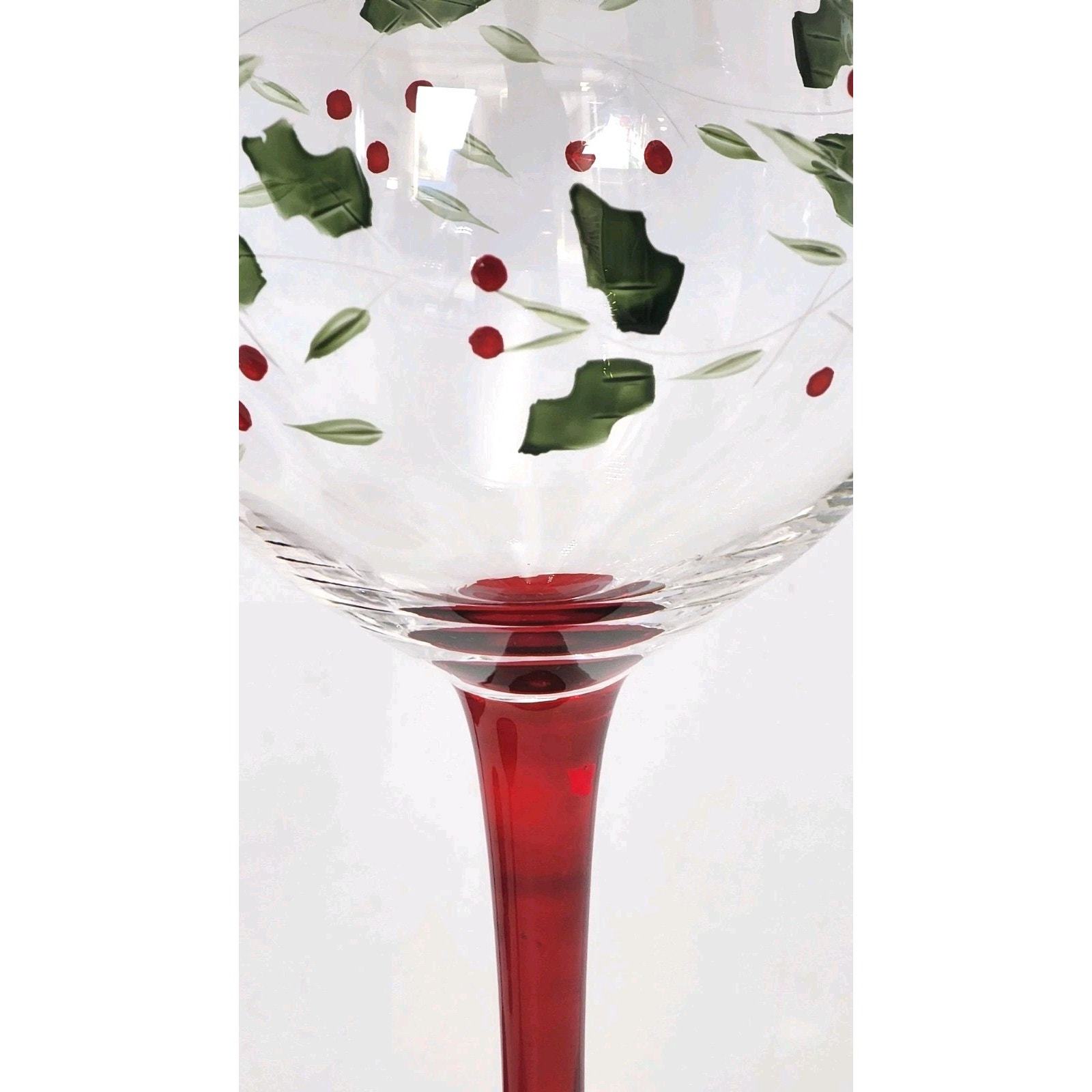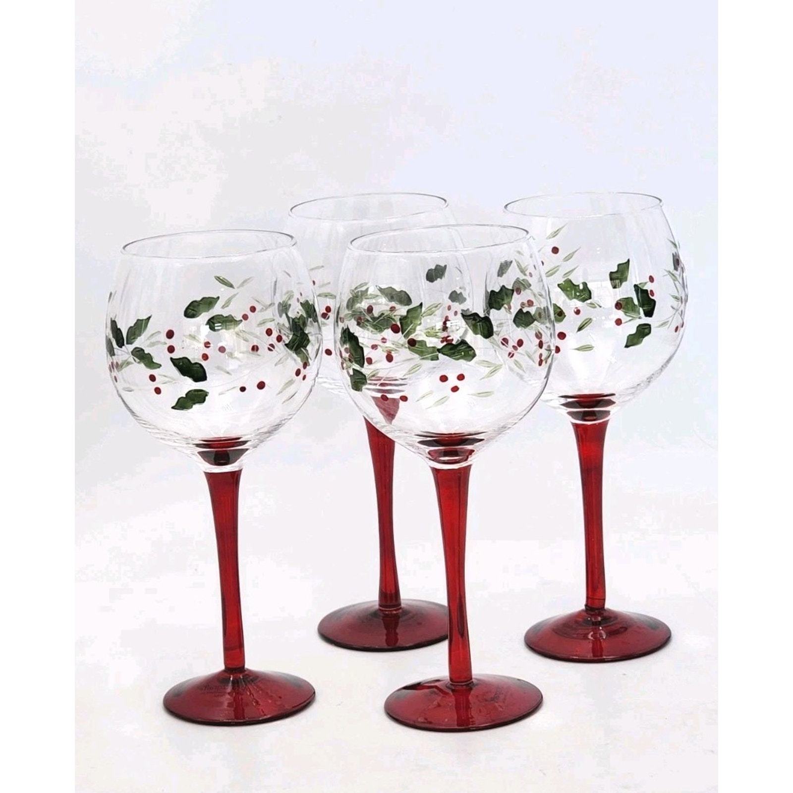 - Pfaltzgraff Winterberry Wine Goblet Set Of 4 Etched and Handed Painted Holly Red