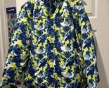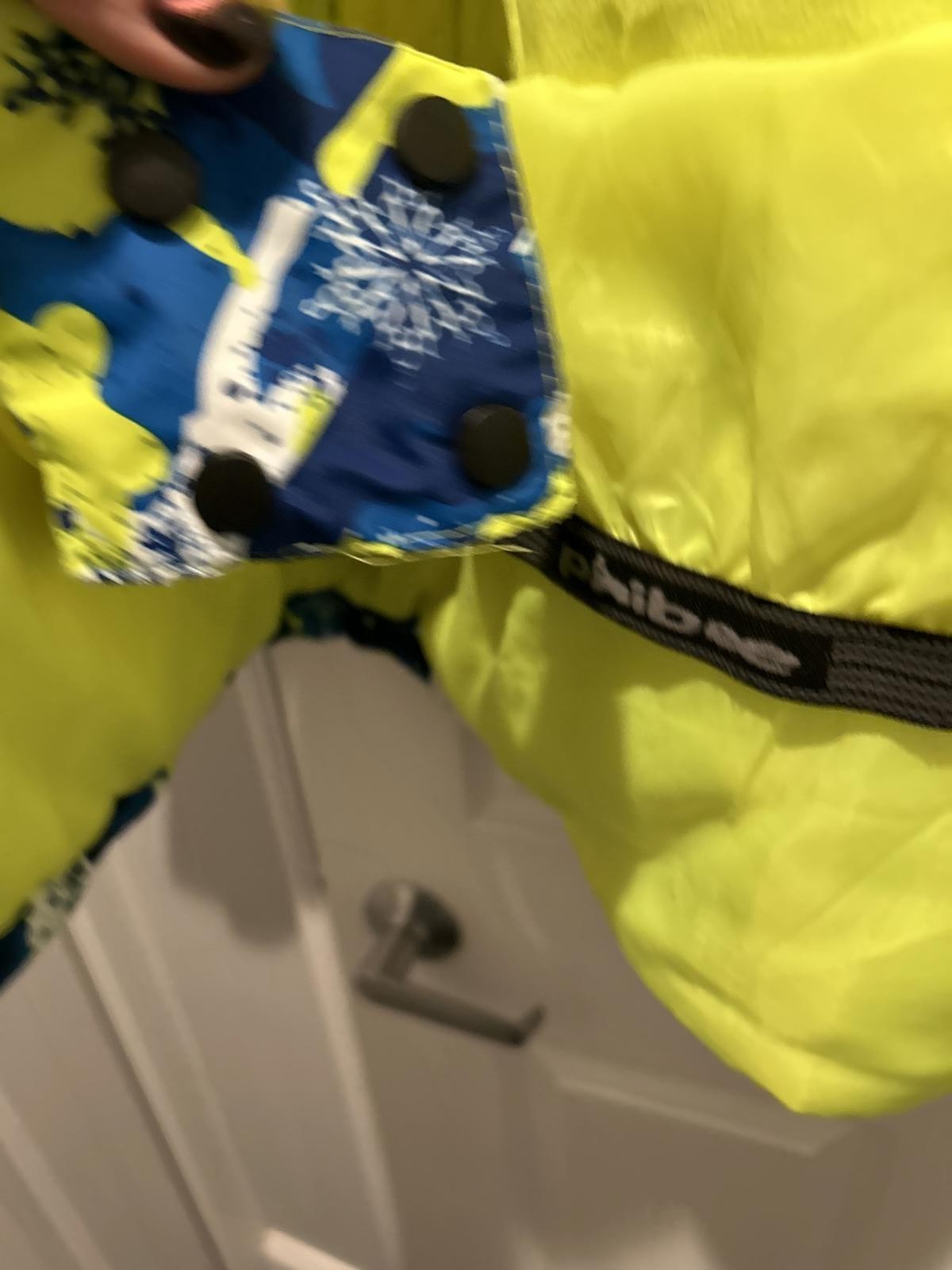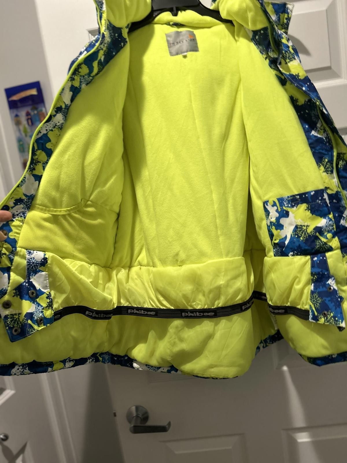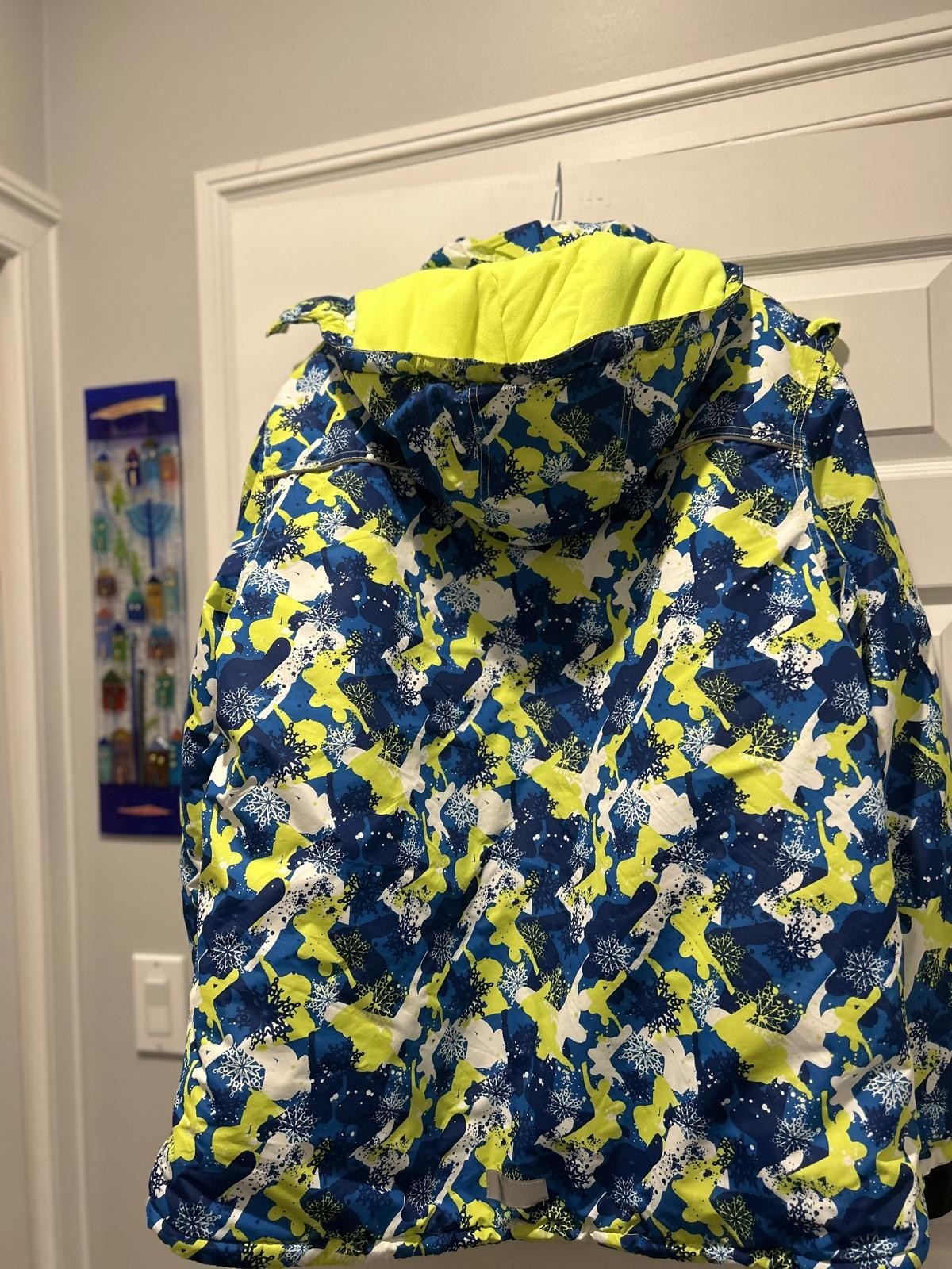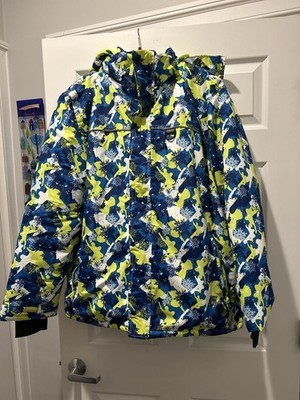 Colorful kids' winter jacket featuring a vibrant blue, yellow, and white pattern.
