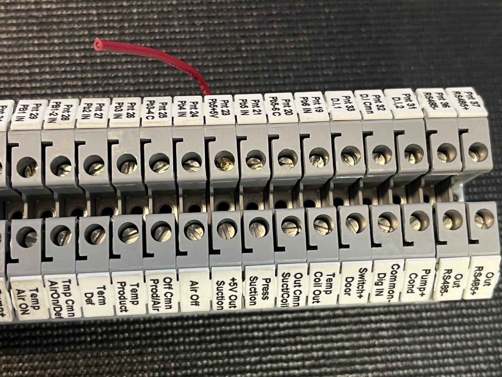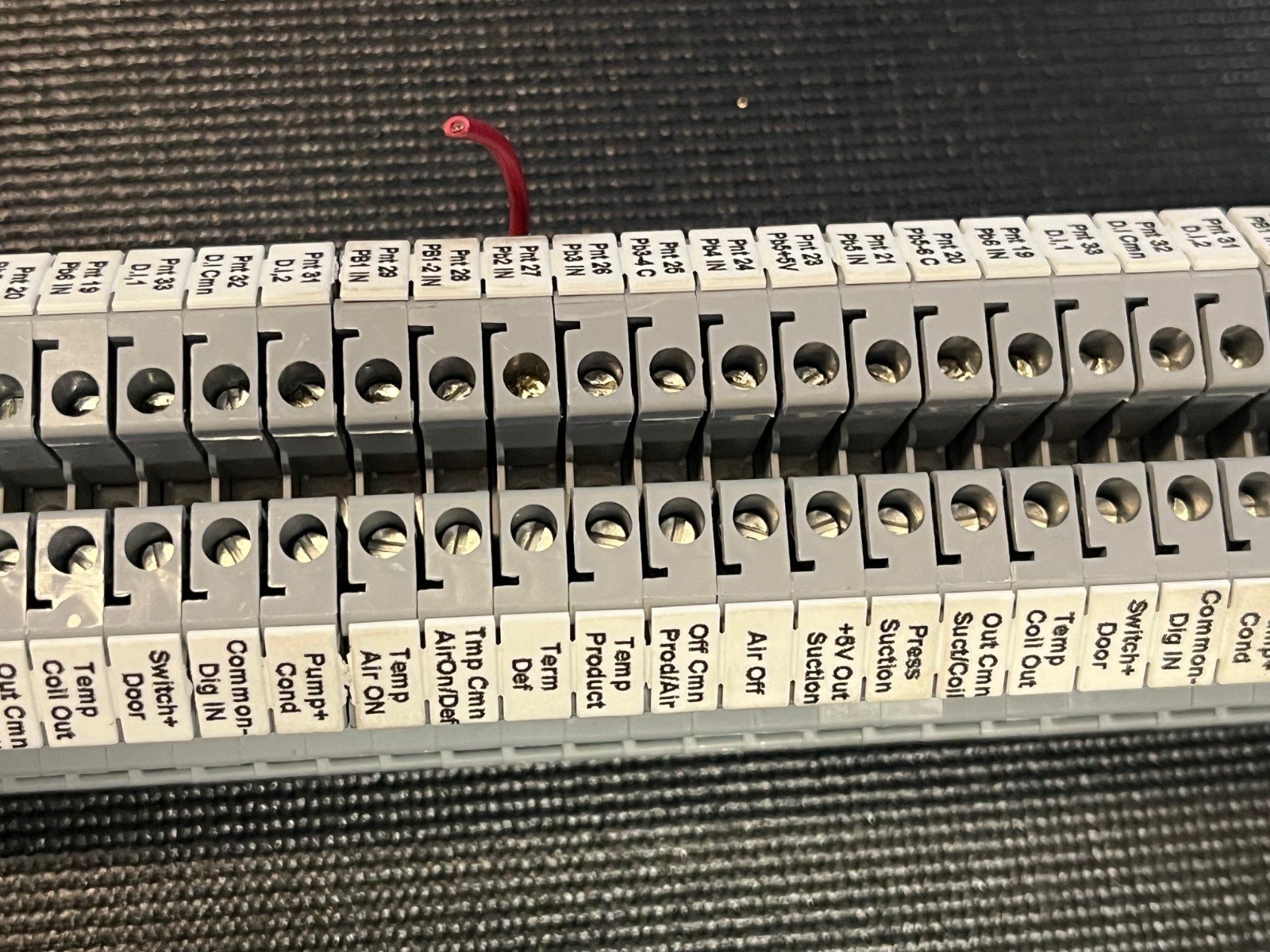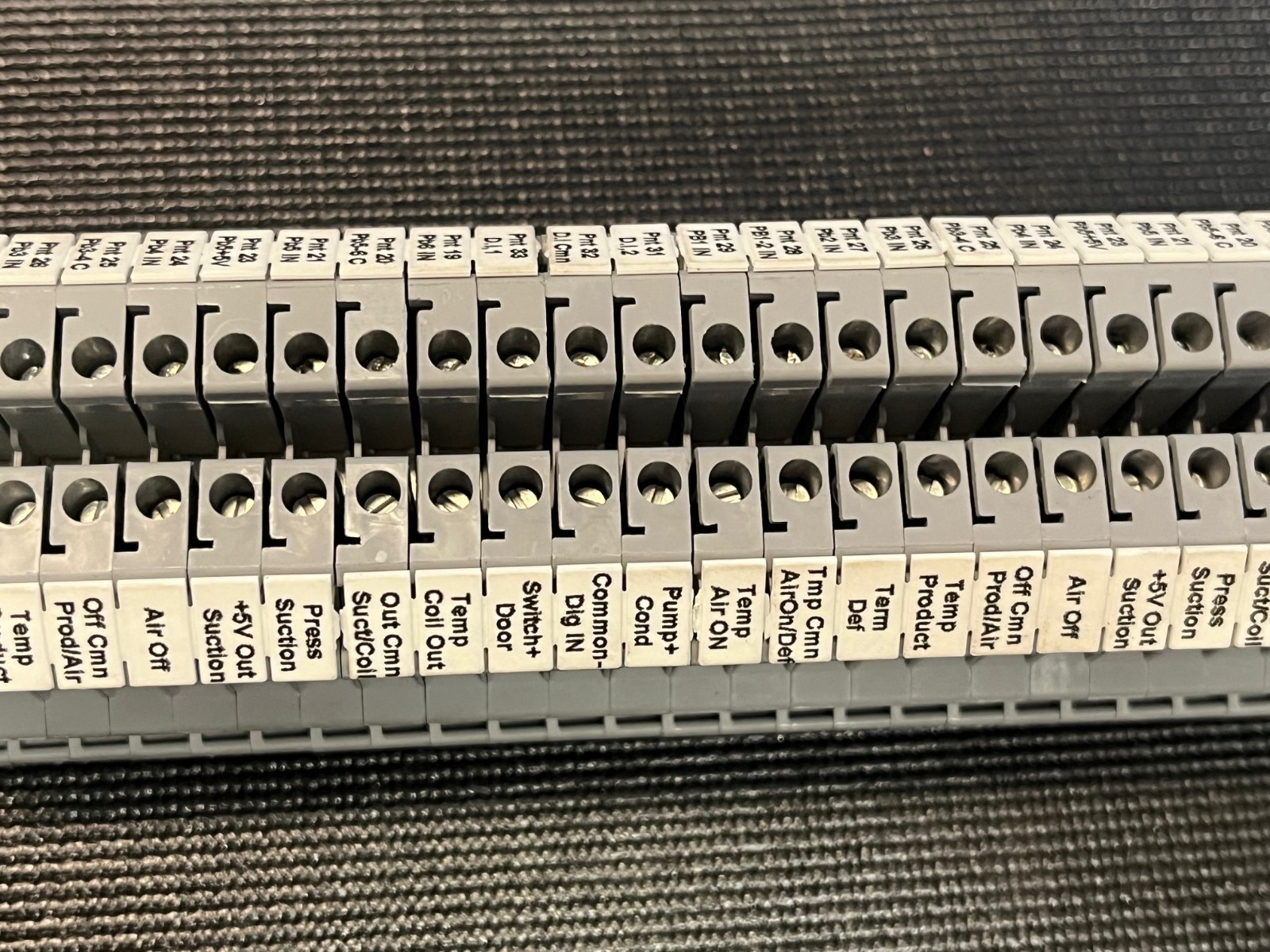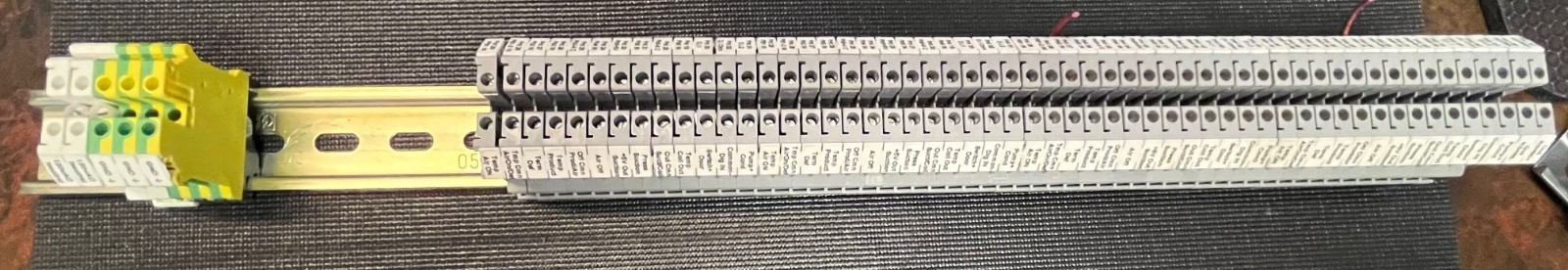 Color/Style: 54 Grey, 2 White, and 3 Yellow Green terminal blocks mounted on a single DIN rail