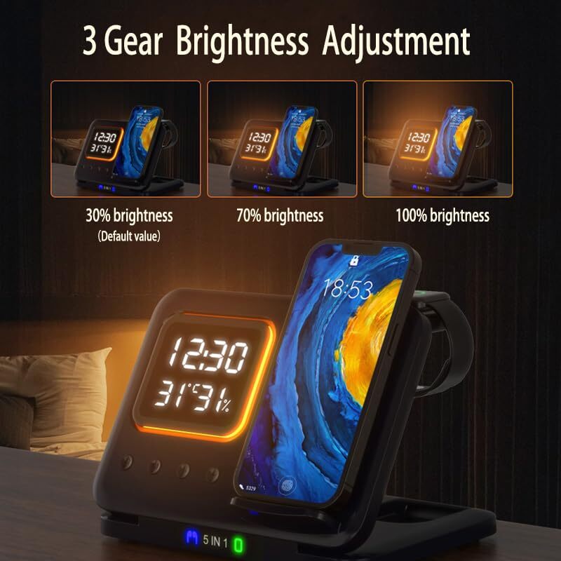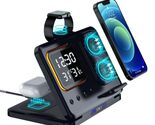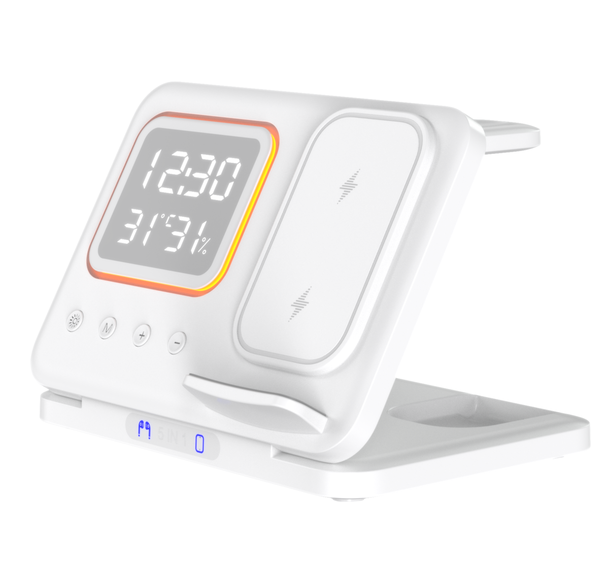 5 in 1 Fast Charging Desktop Standing Magnetic Wireless Charger with Clock and LED Night Light For Mobile Phones, Earphones, Smart Watch, iPhone, Airpod, iWatch, Earbuds, etc