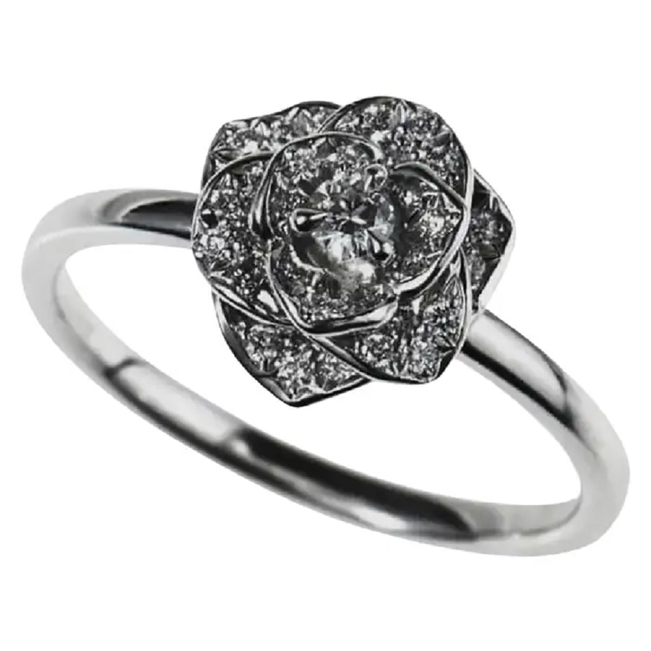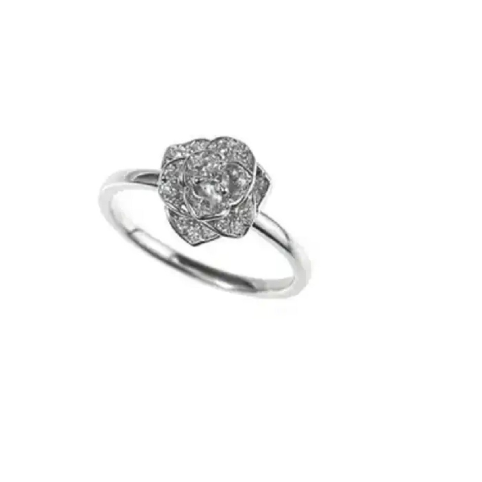 Piaget Rose Ring in Rhodium Material 18K White Gold Diamonds Approximately 0.22ct Stone Cut Brilliant Rose Diameter 10.2 mm X 10.2 mm Rose Height 5mm Ring Size 7 Ring Weight 4.1gr Condition New, never worn