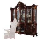 Features: Storage Hutch: 4 Glass Doors (3 Compartments with 2 Glass Shelves) Storage Buffet: 2 Drawer, 4 Doors (Inside: 2 Glass Doors w/1 Glass Shelf, 2 Wood Doors w/1 Shelf) Hutch w/Touch Light Mirrored Back Panel, Oversized Crown, Raised Moldings, and Scrolled Motifs Wooden Case: Wood (Rubberwood), Wood Veneer (Cherry), Moldings: Poly-Resin (Fiberglass), Back Panel: Mirror, DOOR/Shelves: Glass, Magnetic Latch/Catch, LIGHT: Bulb Included Glass Thickness: 5mm (Side Panel Door), 8mm (Shelves), 3mm (Mirrored Back Panel Hutch), Not Included: Cutlery Tray Set Includes: One (1) Hutch Buffet
