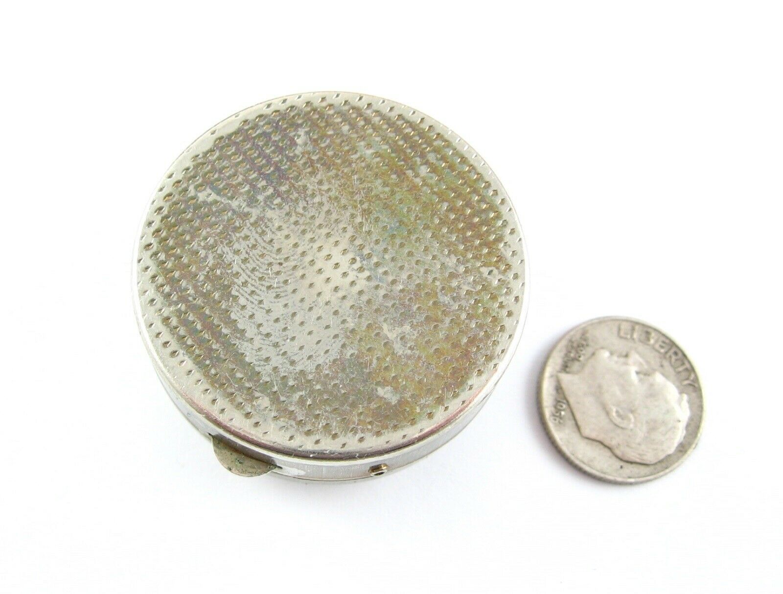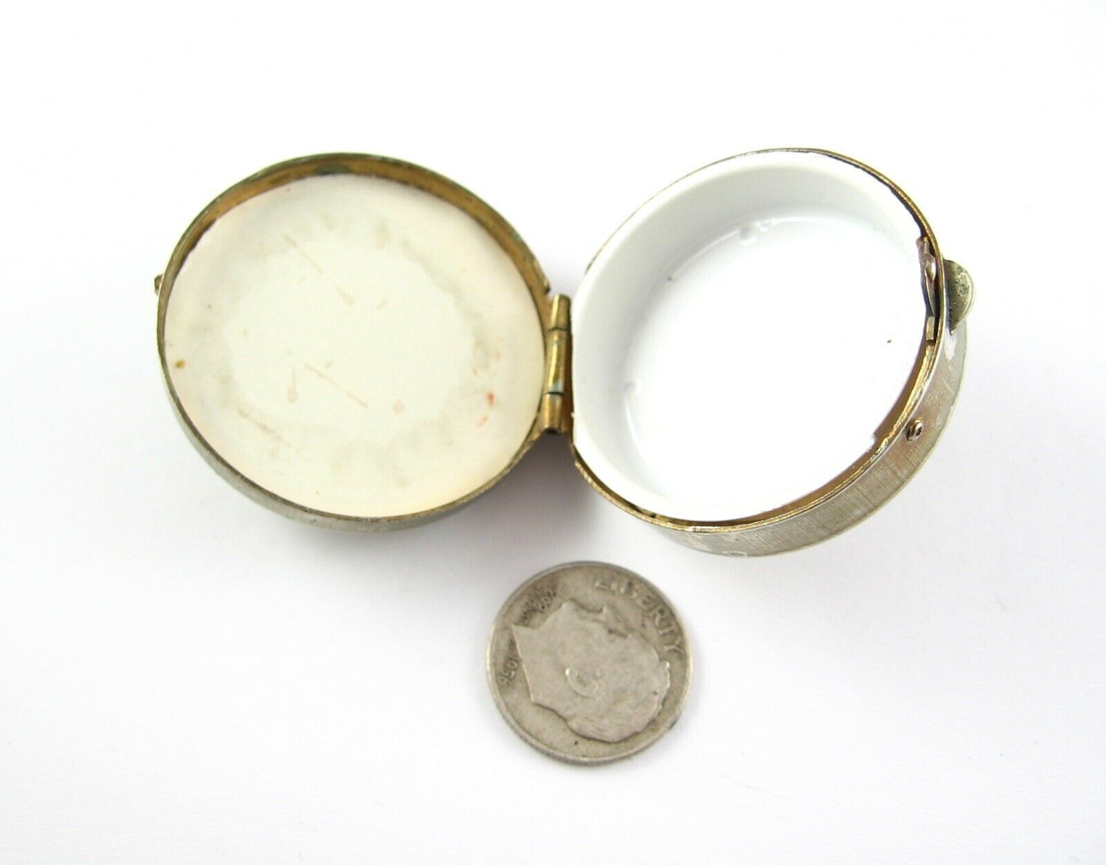 CONDITION: This pill box is in pre-owned and vintage used condition. The porcelain inset is present as is the plastic insert inside. The hinge and lock are in full working order. There is scratching and finish wear present