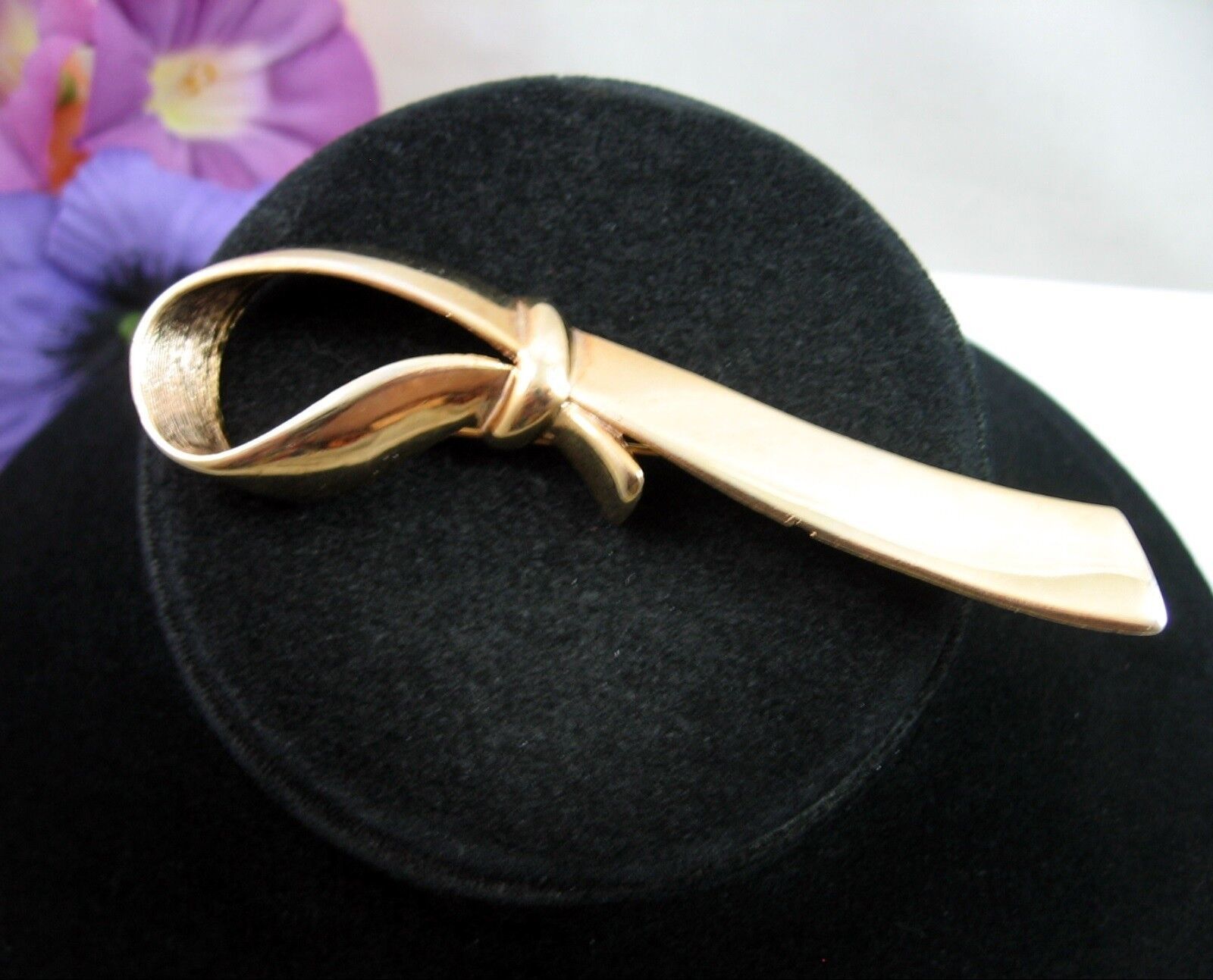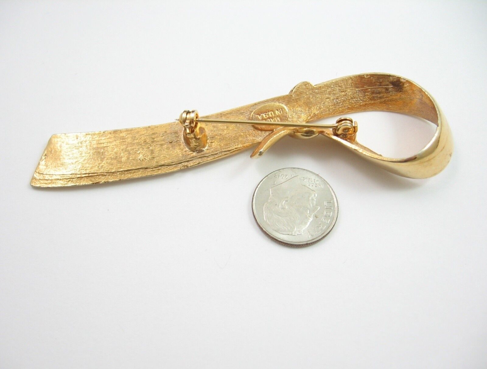 - PIN RIBBON STRIP & CURL Vintage Brooch Goldtone 3 1/2" Length Made in USA