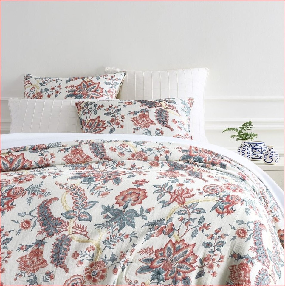 - This adaptation of Indian chintz is reminiscent of fabrics traded by the British East India Company that were fashionable in Colonial America. The beautiful homespun Fairfield bedding speaks of cozy and inviting memories at a historic Williamsburg Inn. Indigo, red and wheat flora and foliage is digitally printed onto light, cool and broken-in pure linen with a supple, soft-handed drape. One of the modern creations from the design collaboration between Annie and West Coast designer Mark D. Sikes, a traditional tailored look with a twist of east meets west.