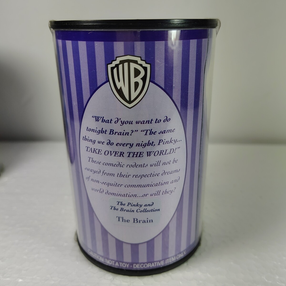 Nostalgic Pinky The Brain Miniature Classic Collection figurines from Warner Bros ? each mouse standing on a tiny globe, sealed in the original WB display tube. Clear plastic dome with purple striped insert, WB shield on top and back text from the show (?What d?you want to do tonight Brain? ?Take over the world!?).