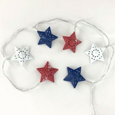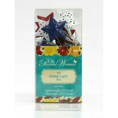 - Pioneer Woman Patriotic Stars LED String Lights 10-pc Red White Blue Metal Timer