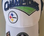 The Pittsburgh Steelers Reebok Super Bowl XLIII Locker Room Hat features the official team logo and colors, making it a must-have for any Steelers fan. This cap is a replica of the one worn by players in the Super Bowl, making it a special piece of memorabilia for fans of the team. With its one size fits all design, this hat is perfect for showing support for the Pittsburgh Steelers in style. Has a blemish in that the Steelers patch round logo is upside down see pics hat is never worn still has cardboard inside mint