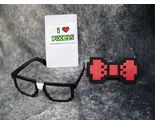 3 Piece Pixel Themed Costume Kit. Glasses have thicker black frames with a piece of white tape in the center and clear lens. Bowtie is Red over a stiff black felt like material. Has black elastic straps with velcro style tabs on the ends. Bowtie is Adjustable. White plastic pocket protector. Has print on the flap and the rest is plain. Unisex. For Ages 14 and up.