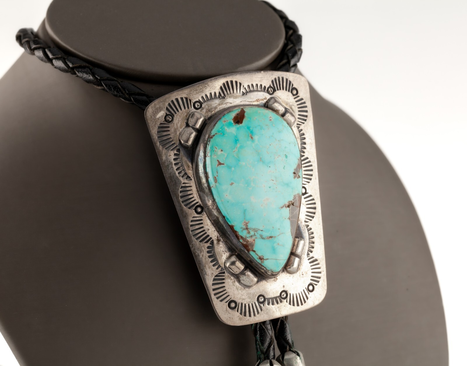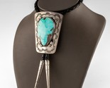 Plaque trapezoide de plata esterlina Turquoise Bolo Bolo con correa de cuero trenzado