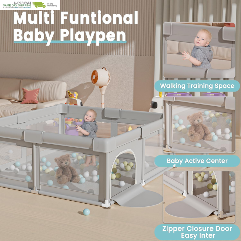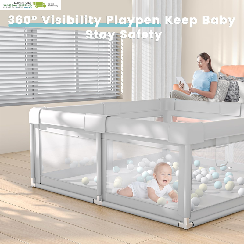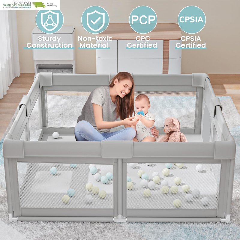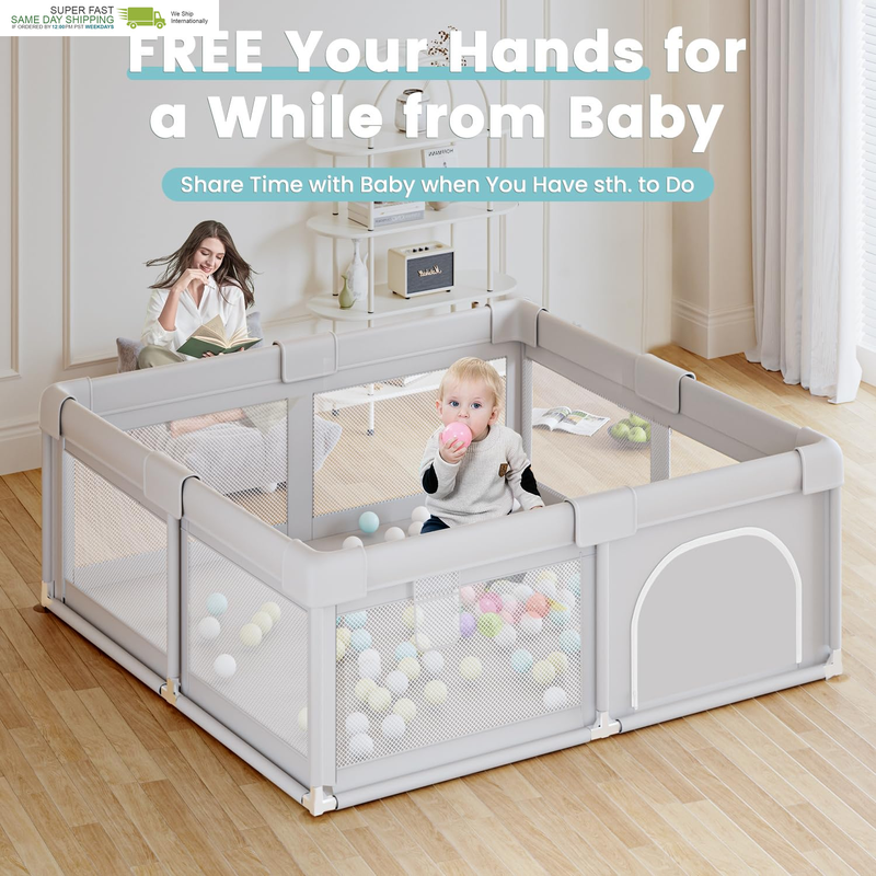 ?Large Play Space?This baby playpen provides a large 50*50 inch play area for babies and toddlers, giving them enough space to play, crawl, and explore freely. Scientific height design helps baby to train stand and walk.