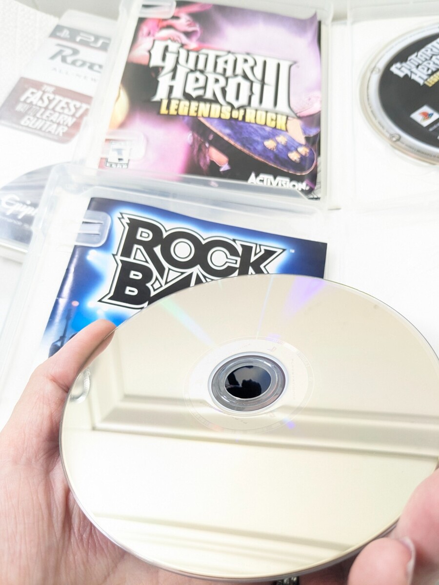 Includes: Guitar Hero III Legends of Rock, RockBand, and Rocksmith 2014(new and sealed) Legends of Rock and Guitar hero have some scuffing/scratches to the discs as shown. See pics.