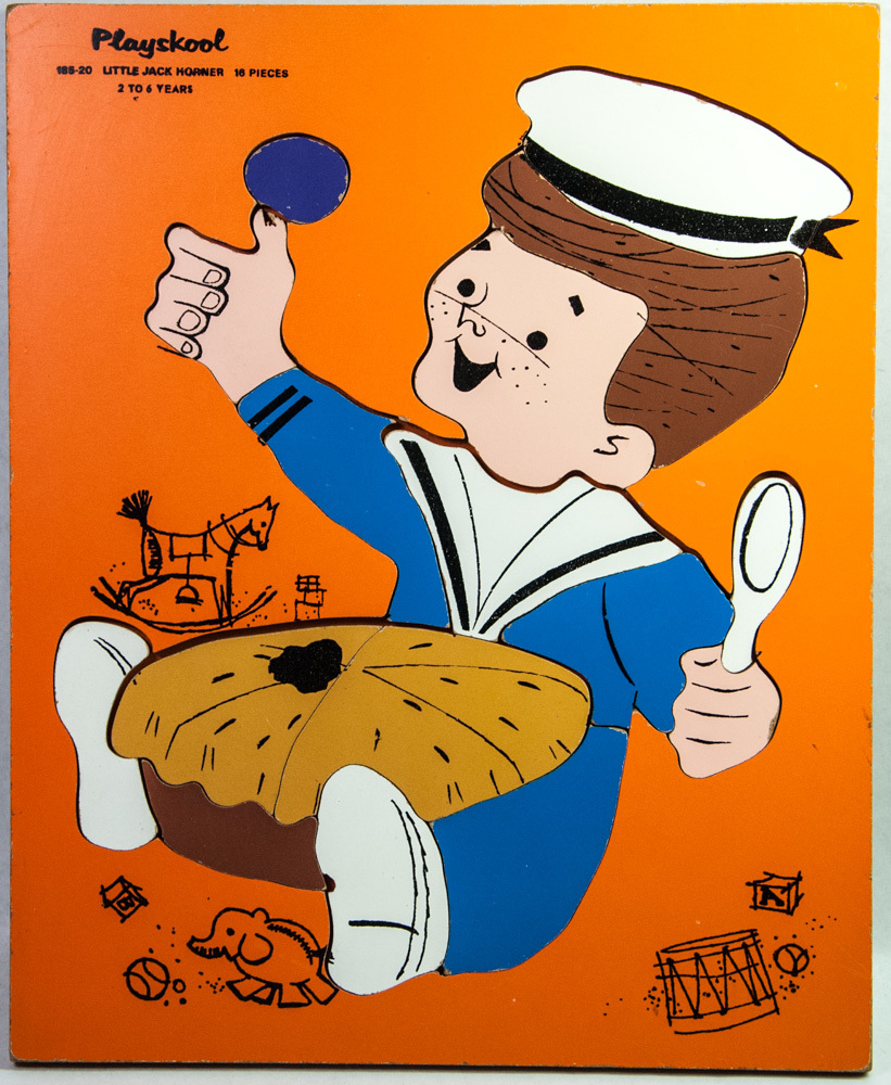Vintage Playskool 16-piece wooden puzzle featuring Little Jack Horner, 185-20. Date of manufacture uncertain, but perhaps early 1960s. The puzzle tray measures 11-1/2" x 9-3/8" x 1/4" thick. Very good, used condition. Two pieces have chips. Complete.
