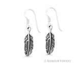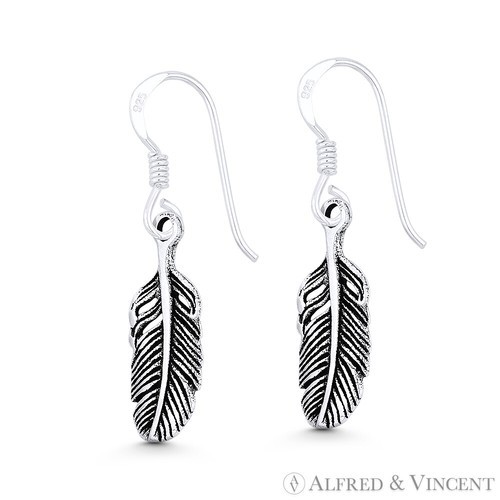 Bird's Wing Feather Charm Dangling Hook Earrings in Oxidized .925 Sterling Silver