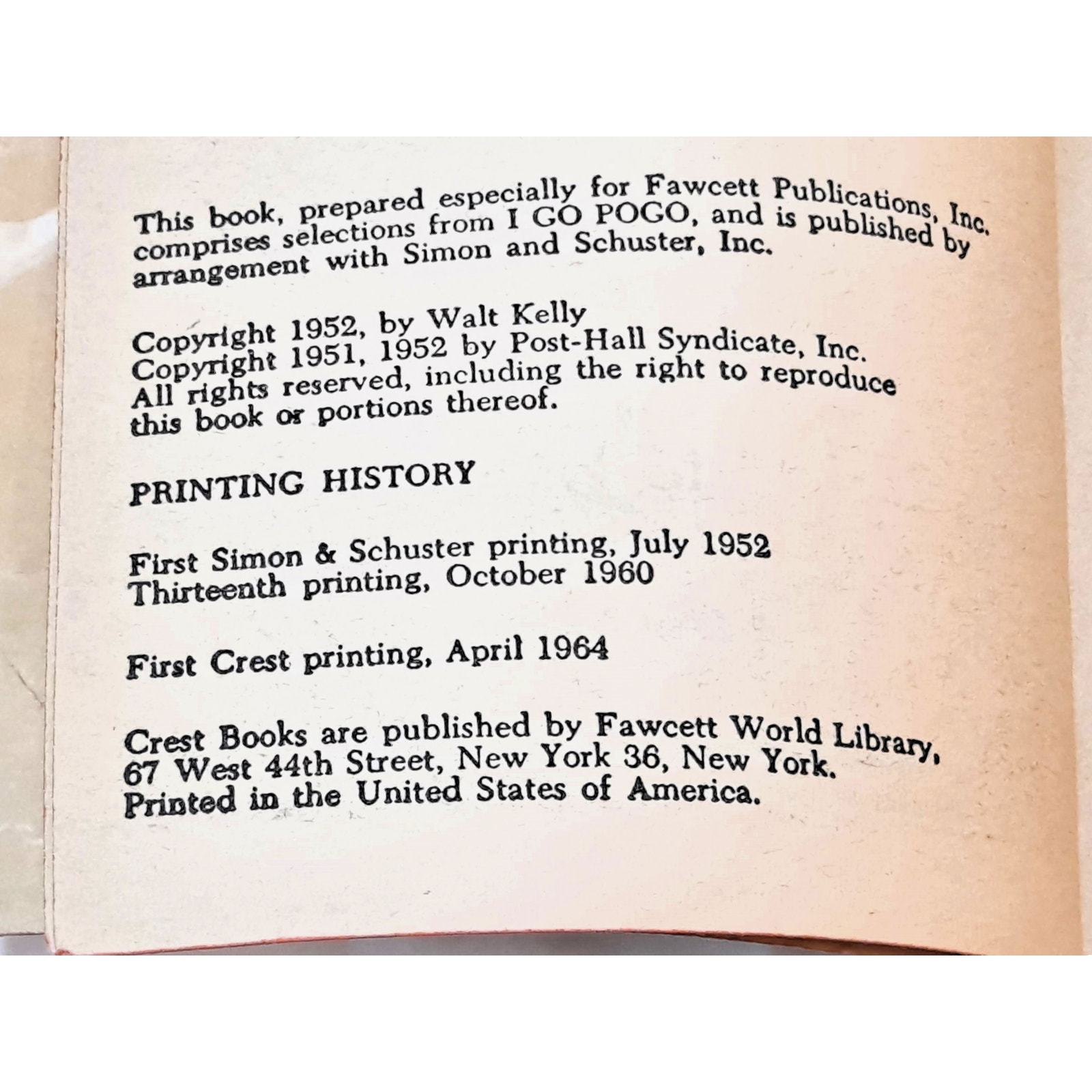 First paperback collection of Pogo comic strips selected from strips originally published in I GO POGO (1952). The copy for sale is the implied first printing of this paperback edition in April, 1964.
