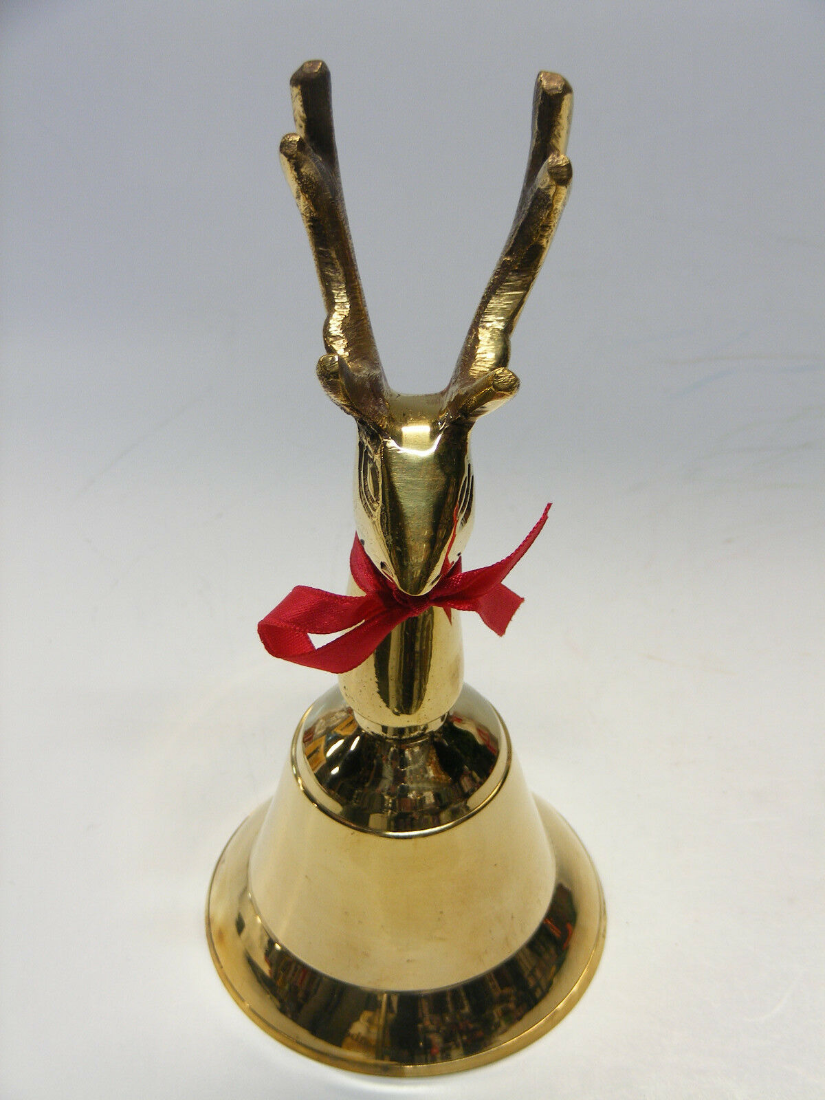 - POLISHED SOLID BRASS REINDEER HEAD CHRISTMAS HAND BELL DINNER BELL w/ RED BOW
