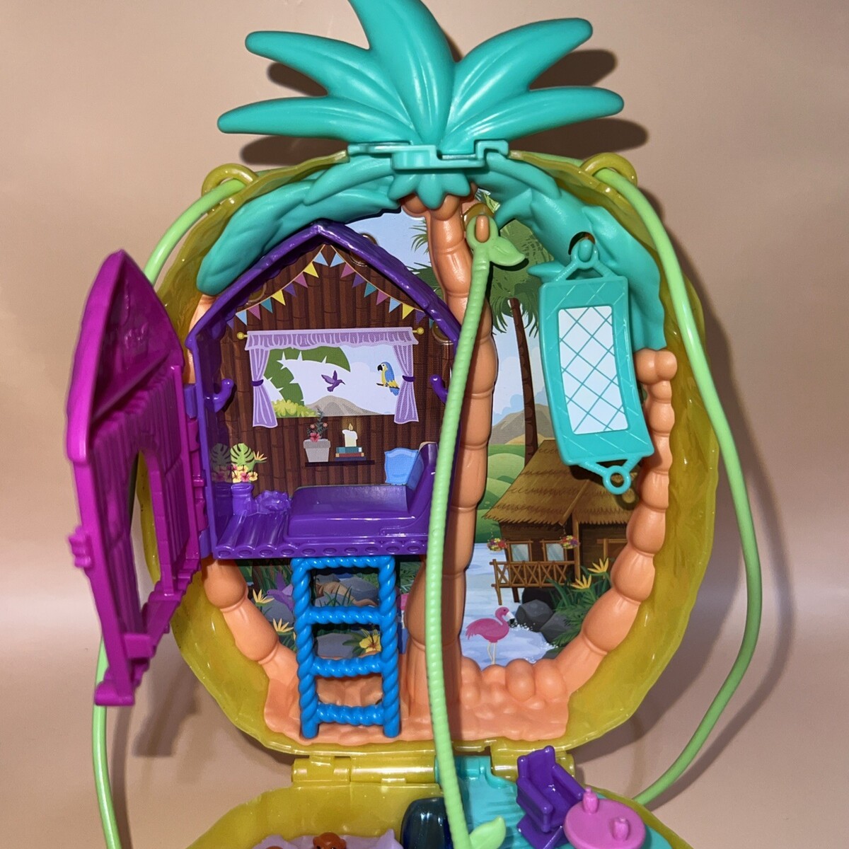 Authentic Mattel Polly Pocket Tropicool Pineapple Purse Compact from 2020. This tropical-themed set opens to reveal a rainforest adventure scene with a treehouse, water play area, cafe seating, and hidden animals. The compact has its original strap so it can be carried as a purse or worn as a belt/fanny pack.