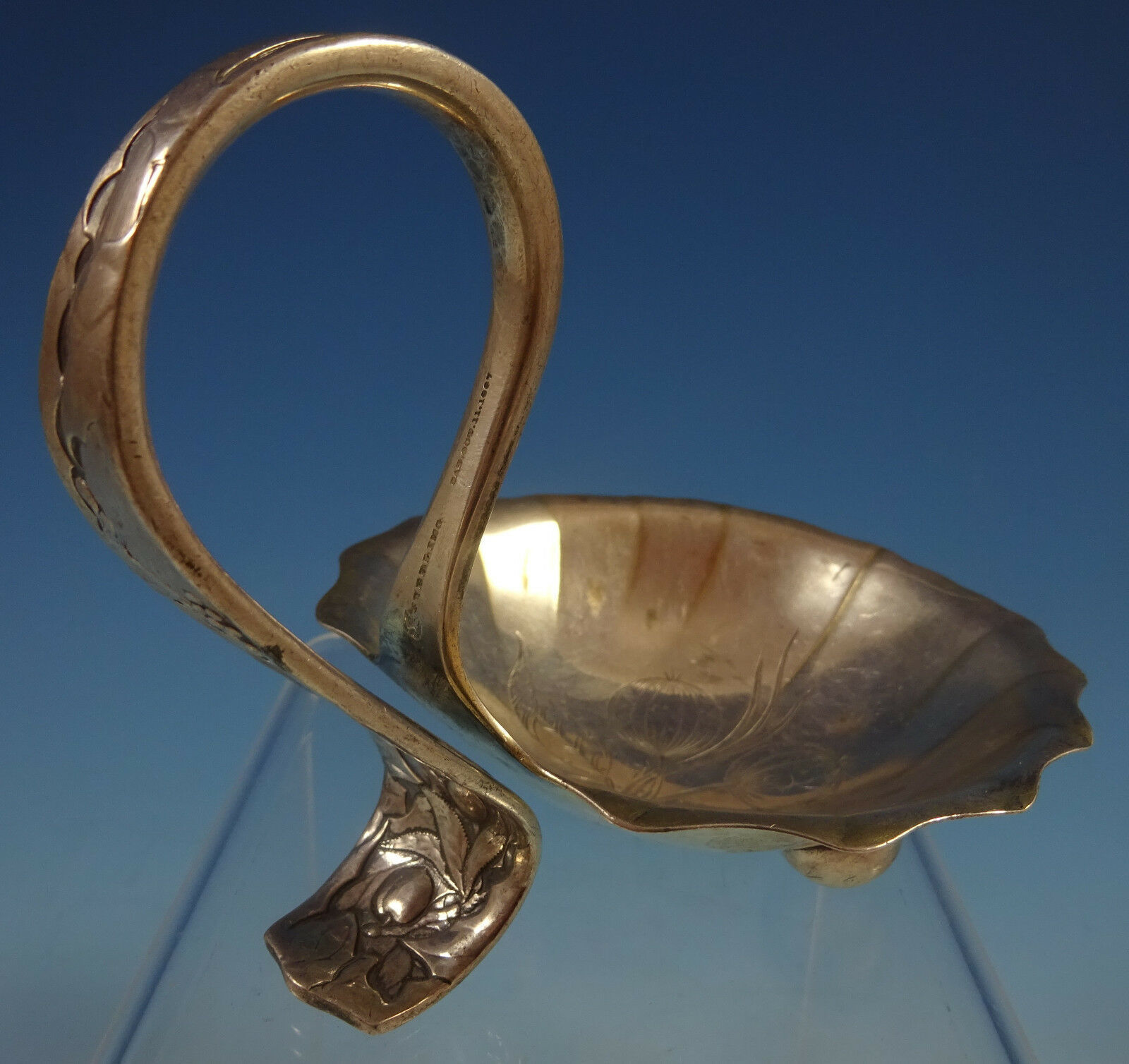 sterling silver nut serving dish. The piece has a curved handle and ball feet.