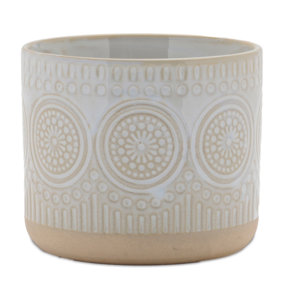 Geometric Mandala and Scalloped Texture: Modern patterns add a sophisticated touch to your space Cool Beige and White Tones: Neutral color palette that blends well with various decor styles Glazed Finish with Unglazed Bottom Accent: Sleek, glossy look with a matte base for added contrast Suitable for indoor use only