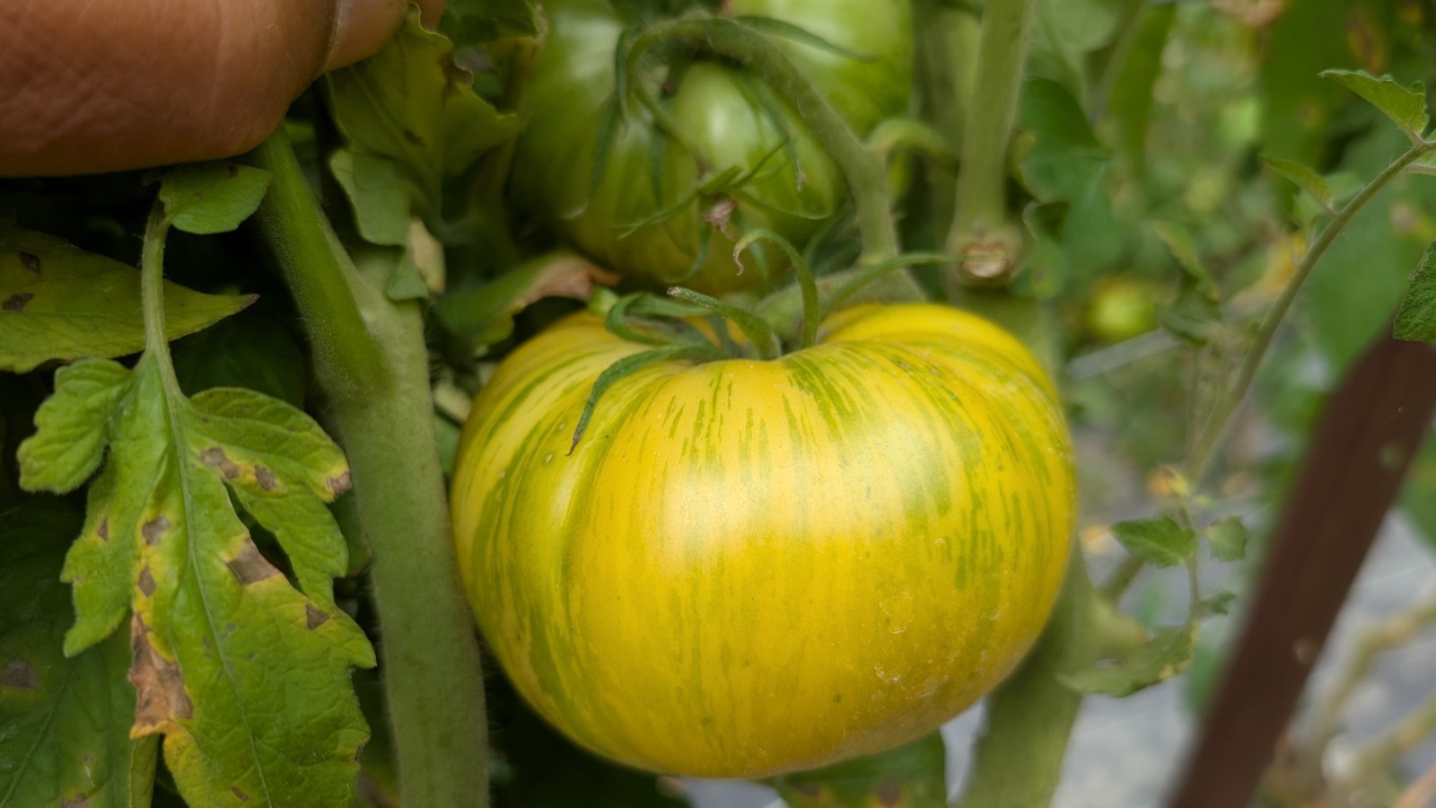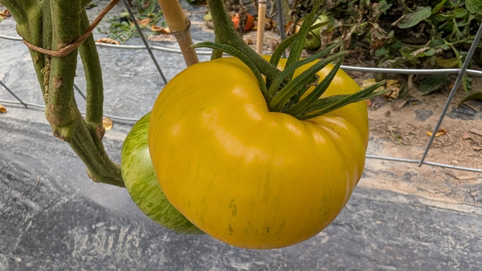 Maturing in approximately 75 to 80 days, Pork Chop is considered mid-season. The fruit is golden yellow with faint green stripes when ripe, often deepening to a rich amber tone. Each tomato measures about 3 to 4 inches across and weighs around 6 to 8 ounces. It is not a cherry tomato.