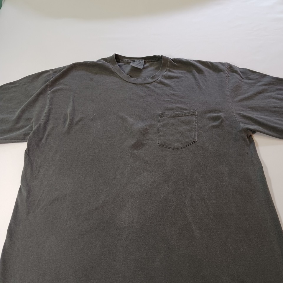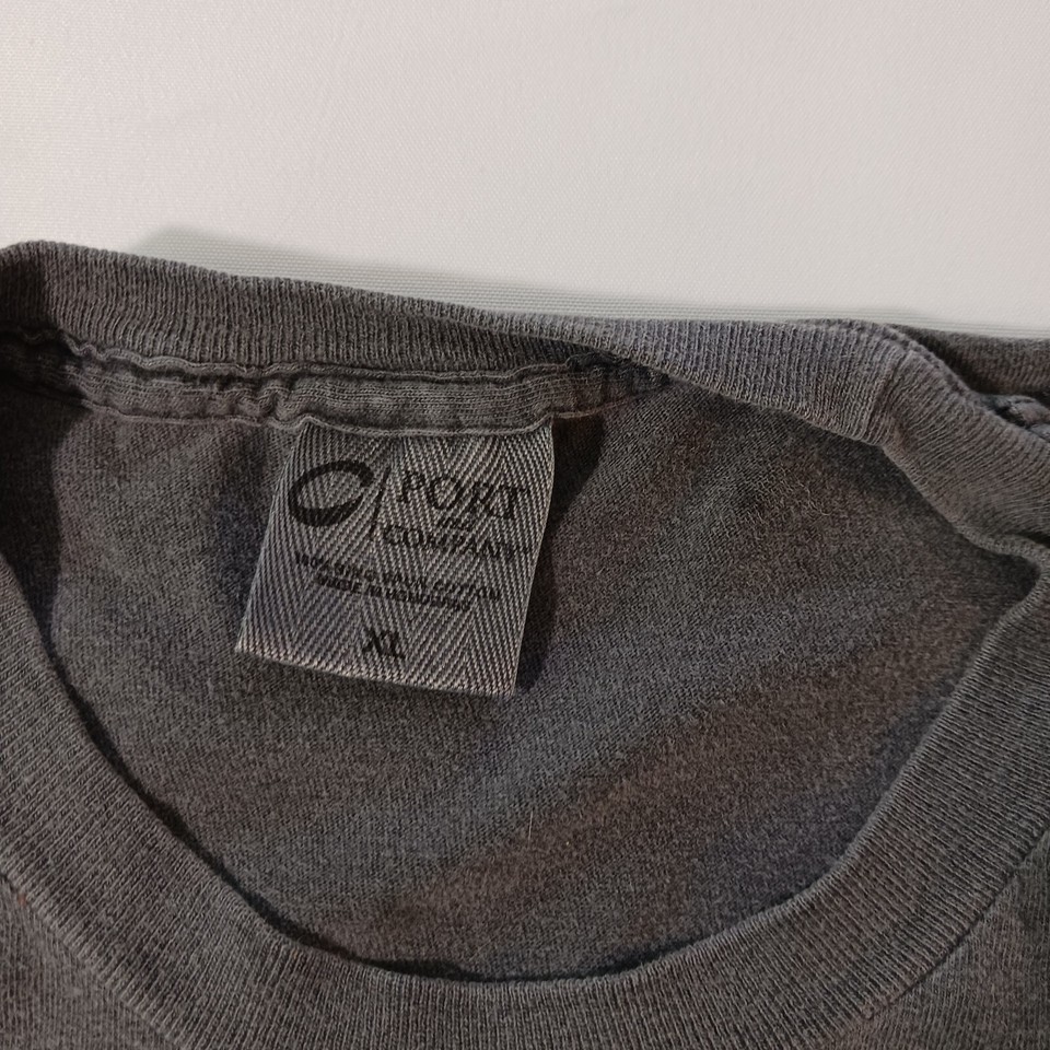 This Port Company T-Shirt is a gray, long-sleeved crewneck shirt made of comfortable ring-spun cotton. It features a graphic print pattern and is machine washable for easy care. The shirt is a size XL and has a regular fit.