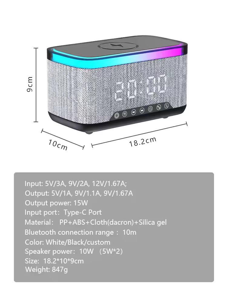 - Portable Bluetooth Speaker with 15W Wireless Charger & RGB Alarm Clock