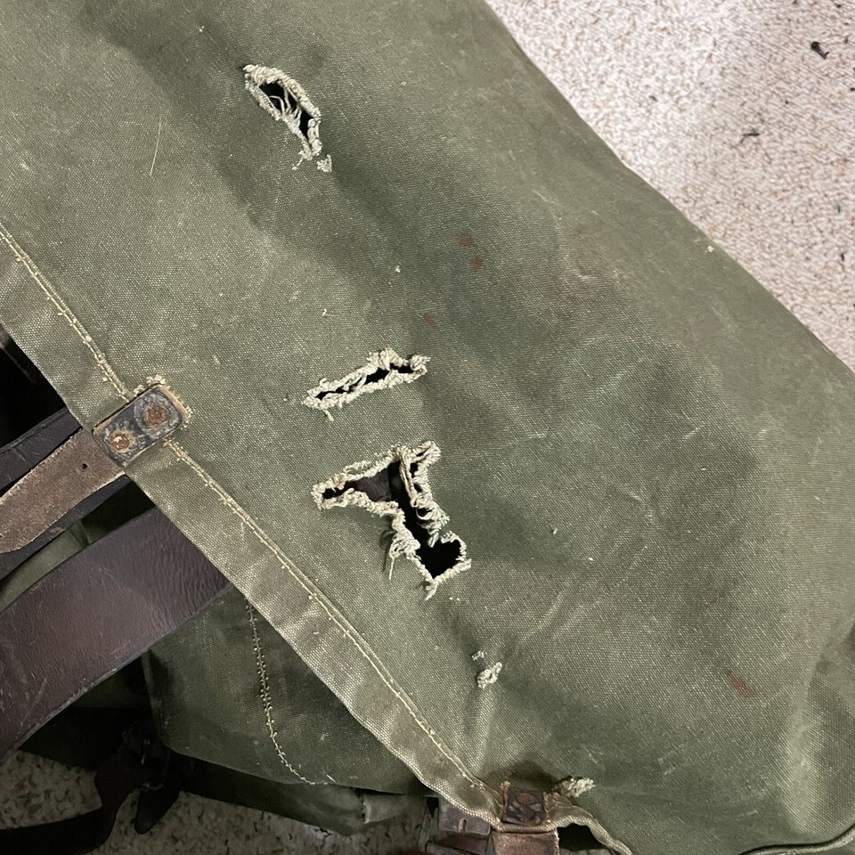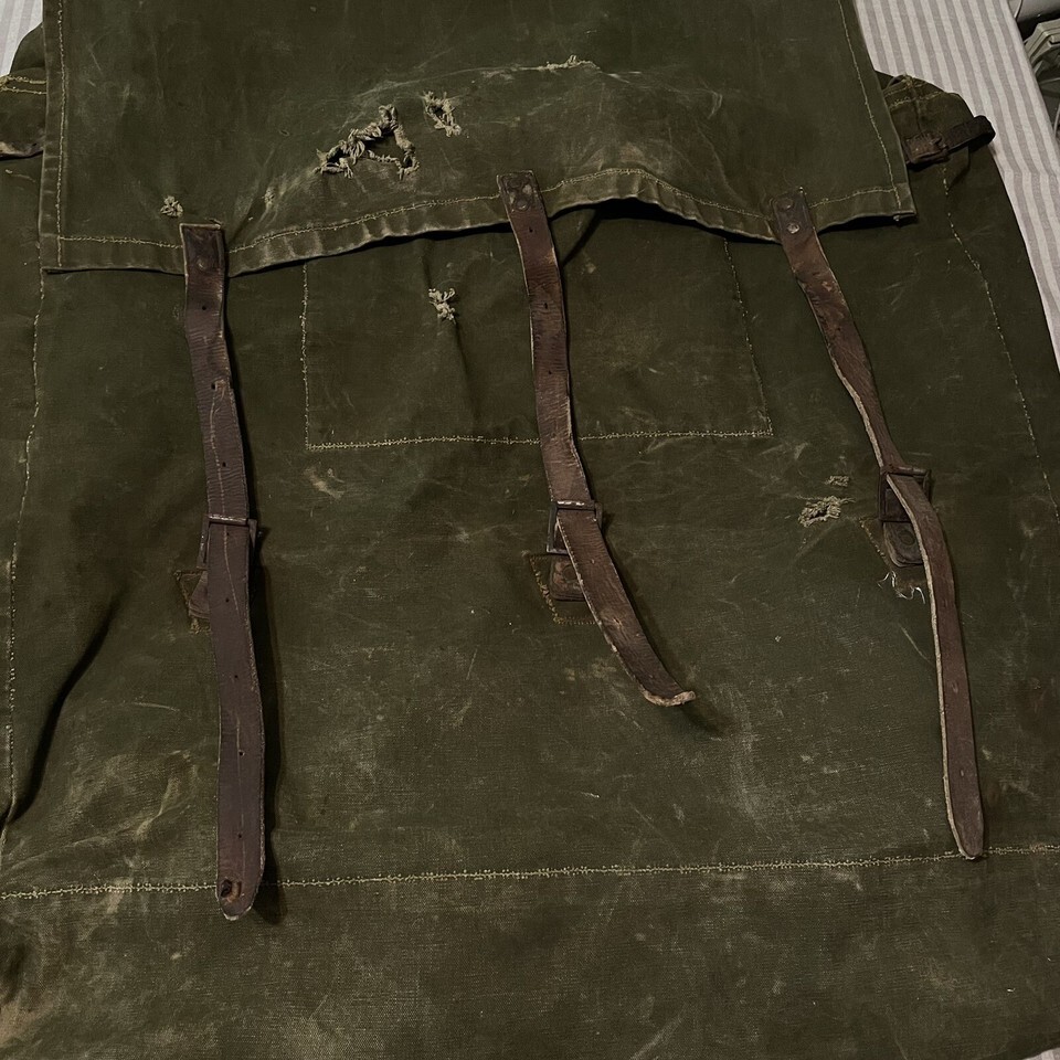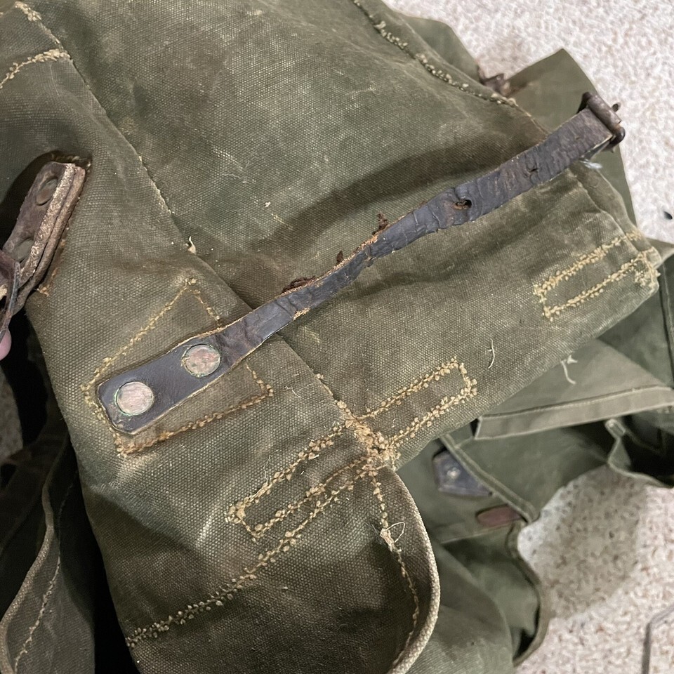 Canvas and leather, the canvas has some holes that could be patched. The leather seems decent for the age, but not sure it could still hold up for use.
