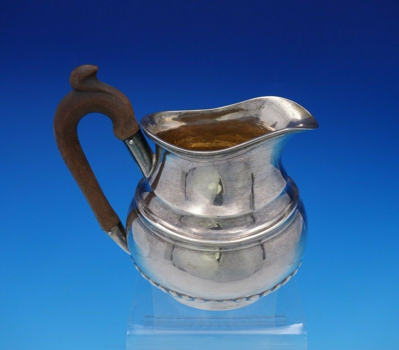 1 - Creamer (with wood handle): Measures 5 1/2" x 4" x 5 3/8" tall and weighs 10.10 troy ounces.