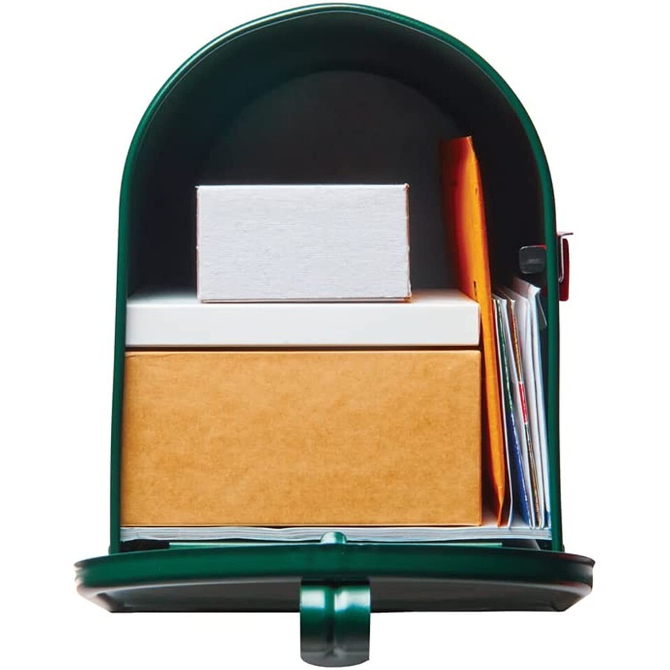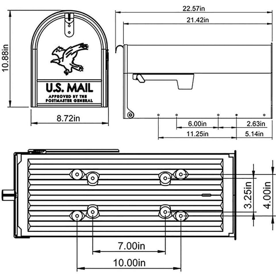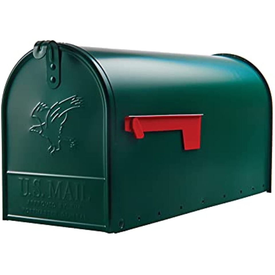 2041-7077 Color: Green Features: -Style: Elite. -Mailbox material: Galvanized steel. Material: -Steel. Dimensions: Overall Height - Top to Bottom: -11". Overall Width - Side to Side: -9". Overall Depth - Front to Back: -22.8". Overall Product Weight: -7.6 lbs.