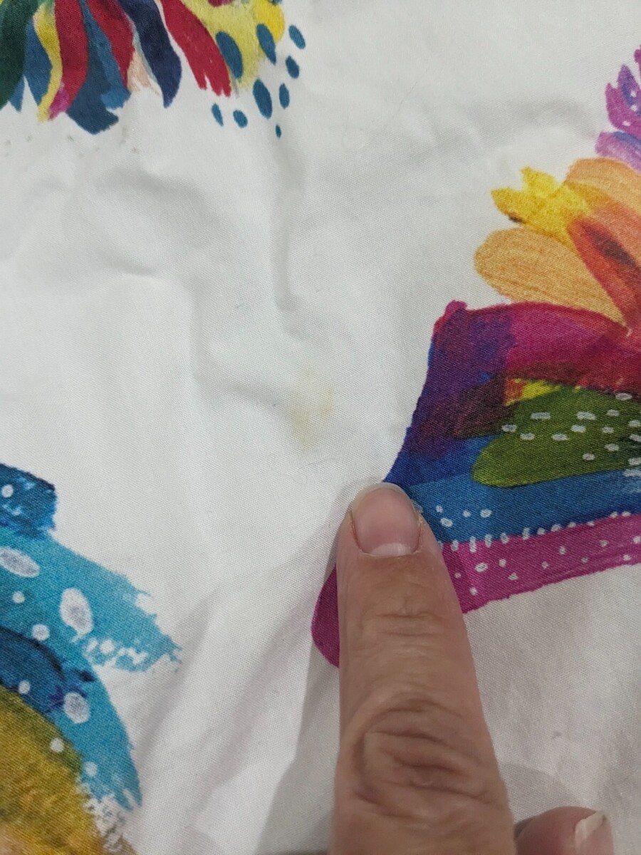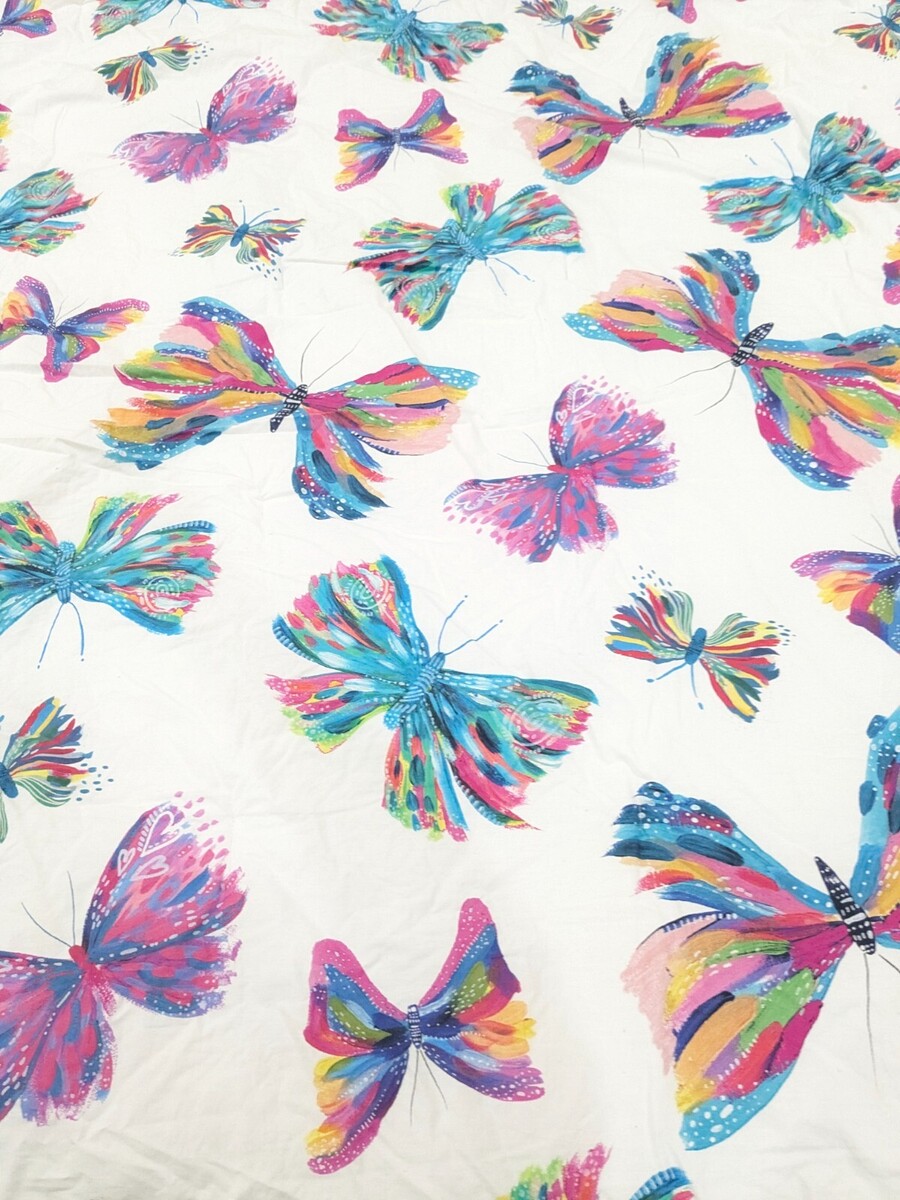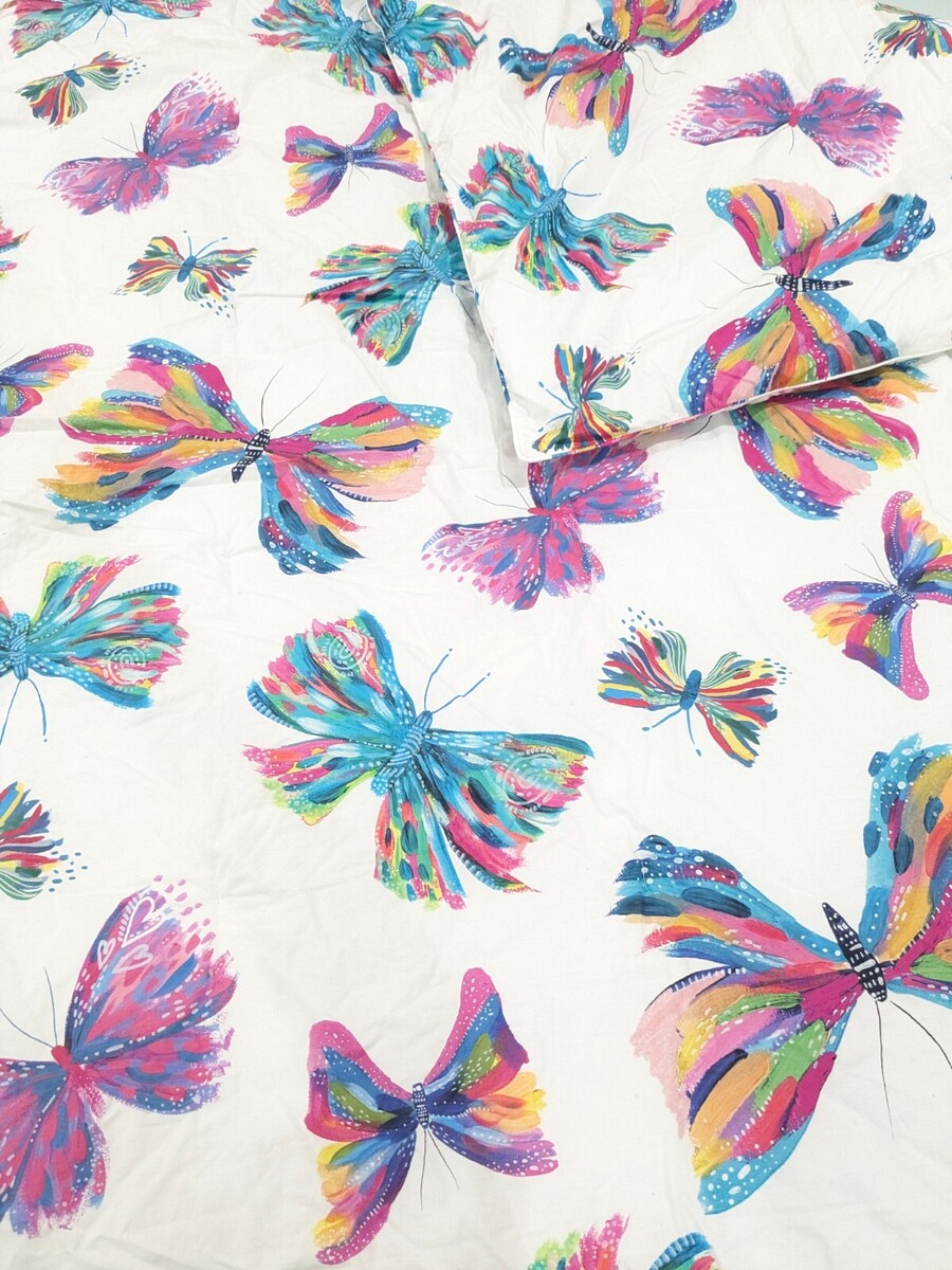Gorgeous white comforter with watercolor style butterflies. Lovely jeweled colors. Some light marks/stains as shown that aren't very noticeable. Comforter been washed, but has a perfumed smell from the previous owner. Overall very good condition.