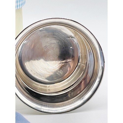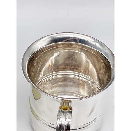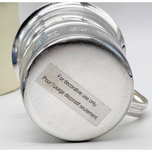 The cup is in overall good condition but could use some polishing. There is one tiny dent in the side that shows on the inside and the outside. The packaging has some shelf and storage wear. The photos are useful for seeing condition and other details.