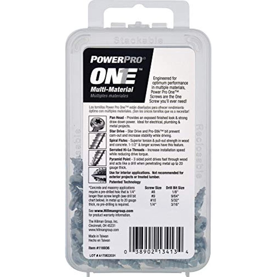 Engineered for optimum performance in multiple materials, Power Pro One screws are the One screw you'll ever need. Developed to outperform and replace standard wood, sheet metal, and concrete/masonry screws, the One Screw program simplifies your tool box by using a single, innovative, engineered screw design to satisfy projects that fasten into wood, metal, concrete, drywall, and plastic. This zinc plated screw is ideal for interior applications; it is not recommended for exterior projects or treated lumber. Common applications include electrical, plumbing, and metal projects. The pan head design and star drive provide an exposed finish look and strong draw-down power. Manufactured with spiral flutes, serrated hi-lo threads, and a 3-sided pyramid point, no pre-drilling is required in wood, drywall, plastic, or metal up to 20 gauge thick. Concrete and masonry applications require a pre-drilled a hole, see product packaging for pre-drilling instructions. Each package includes a free durable Pro-Stik Star Driver Bit. All One Screw products offer a limited lifetime warranty.
