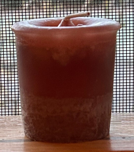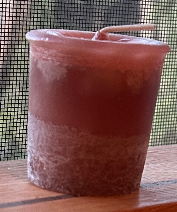 This brownish-gray candle measures approximately 2 inches tall, and has been scented with musk, clove and patchouli. Made in the U.S. by Crystal Journey Candles.