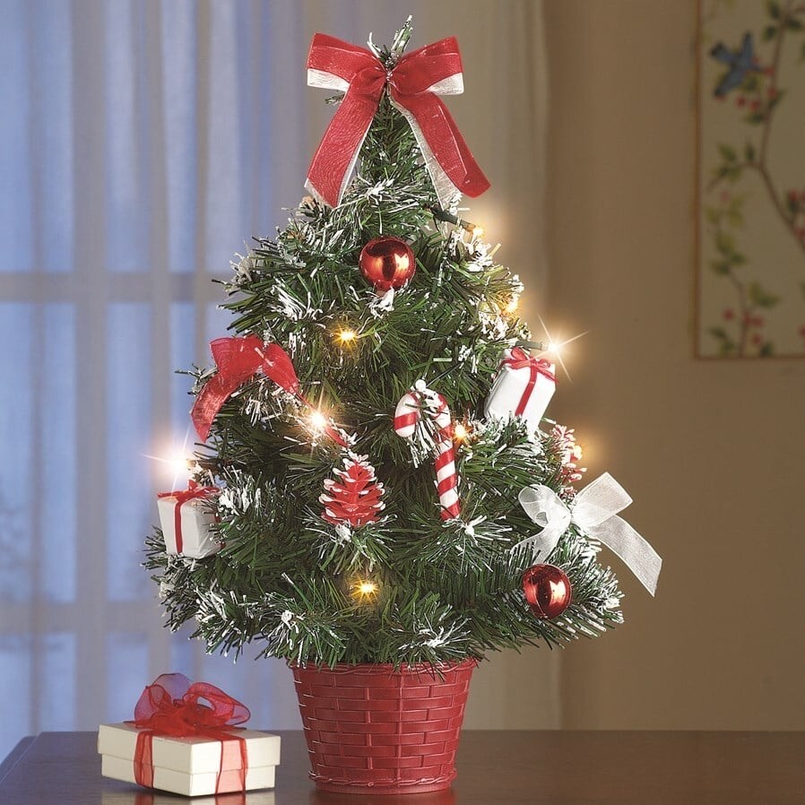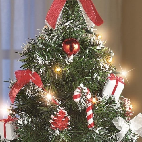 Perfect as a centerpiece, on a desk in your office, mantel, table or anywhere in your home, this beautiful tree sparkles and shines with holiday cheer. The red tree has candy canes and presents and features 10 lights, bright bows, ornaments and pinecones. The branches have a lovely snow-tipped look.