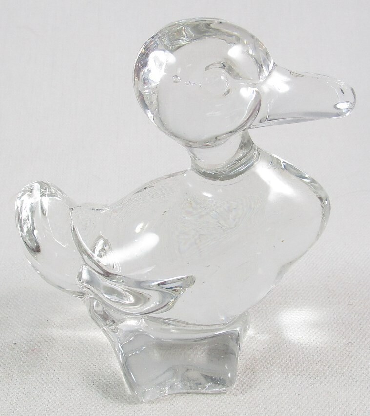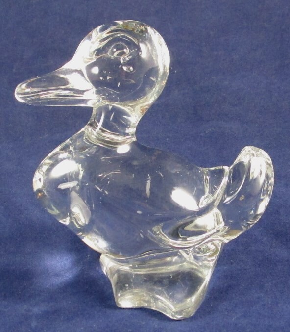 This adorable glass duck figurine stands about 3-3/4" tall and is around 3-1/2" in length. It is not marked but because of its weight (about 10.5 ounces), I think it is lead crystal.