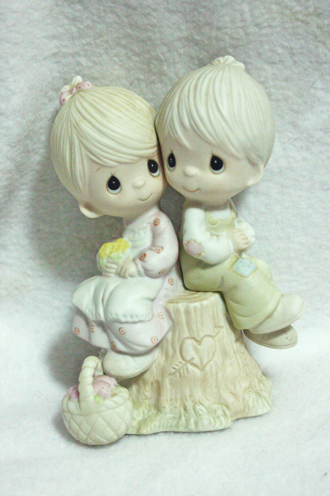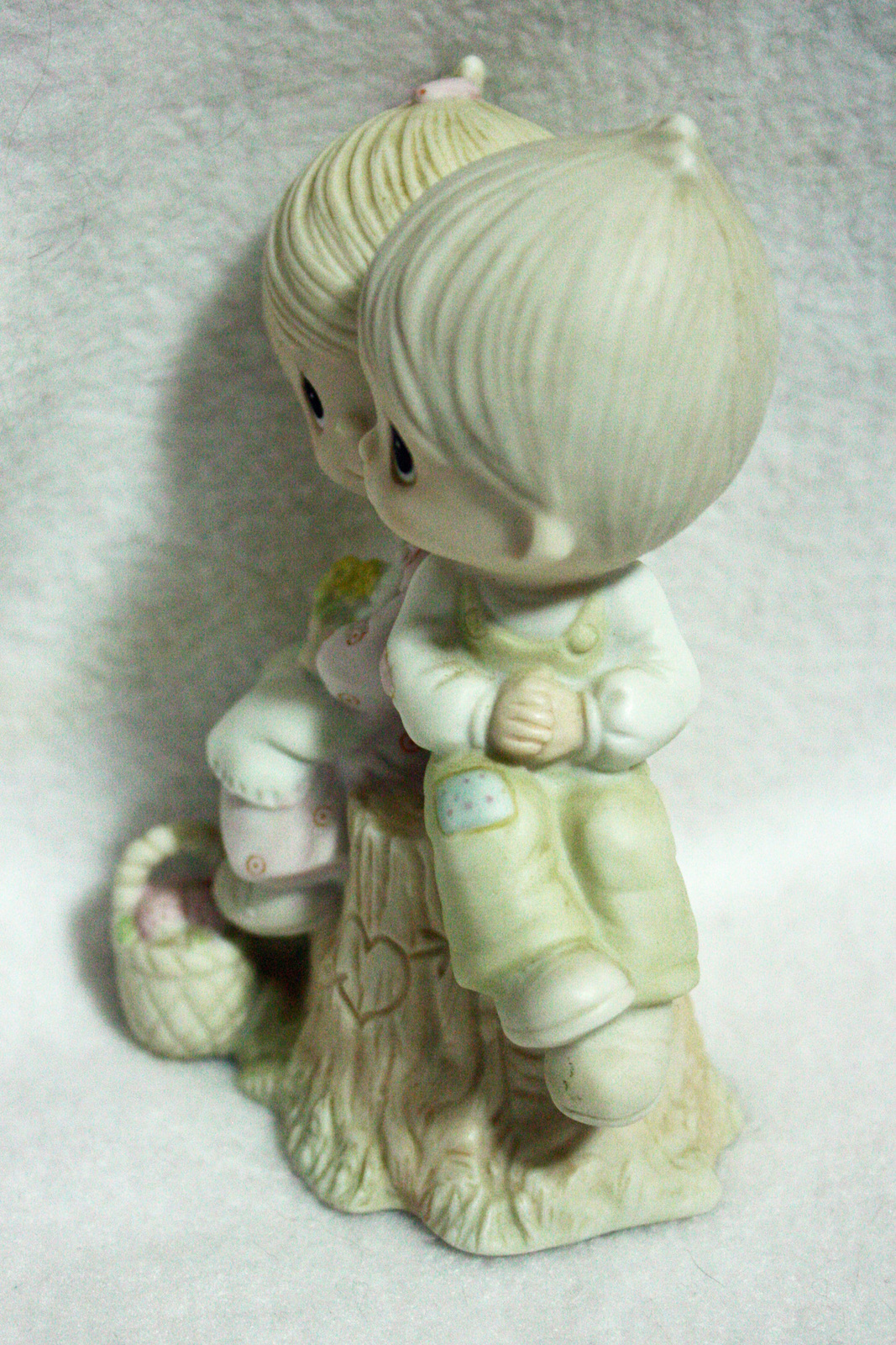 This is a Precious Moments couple figurine titled "Love One Another" that is in excellent condition. The figurine is of a coupe sitting on a tree stump that has a heart carved into it. There also is a lunch basket in the corner. There are no chips, breaks, or markings on the piece. It is numbered E-1376 and is from 1976.