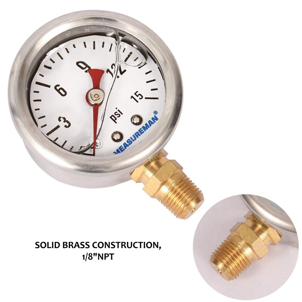 - Precision 1-1/2" Fuel Pressure Gauge - Glycerin Filled, 0-15Psi, Stainless Steel