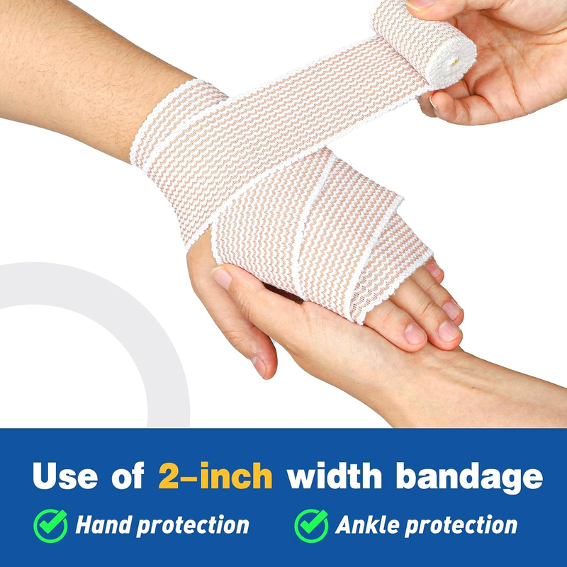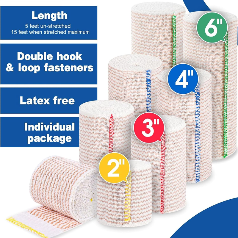 Individually packed: The individually packaged 8 packs compression elastic bandage contains two rolls of 2-inch, 3-inch, 4-inch and 6-inch high-quality elastic bandages. Our bandages are a standard length of 5 feet, and the maximum stretch length of the product is 15 feet for maximum coverage