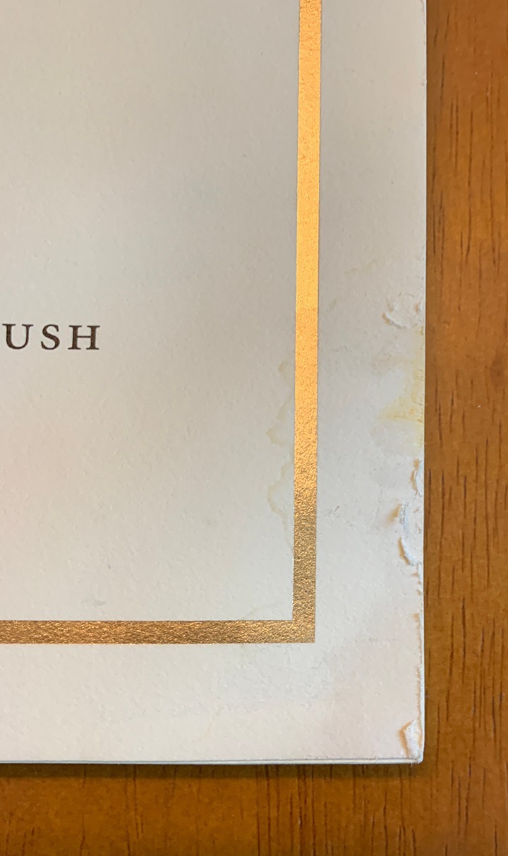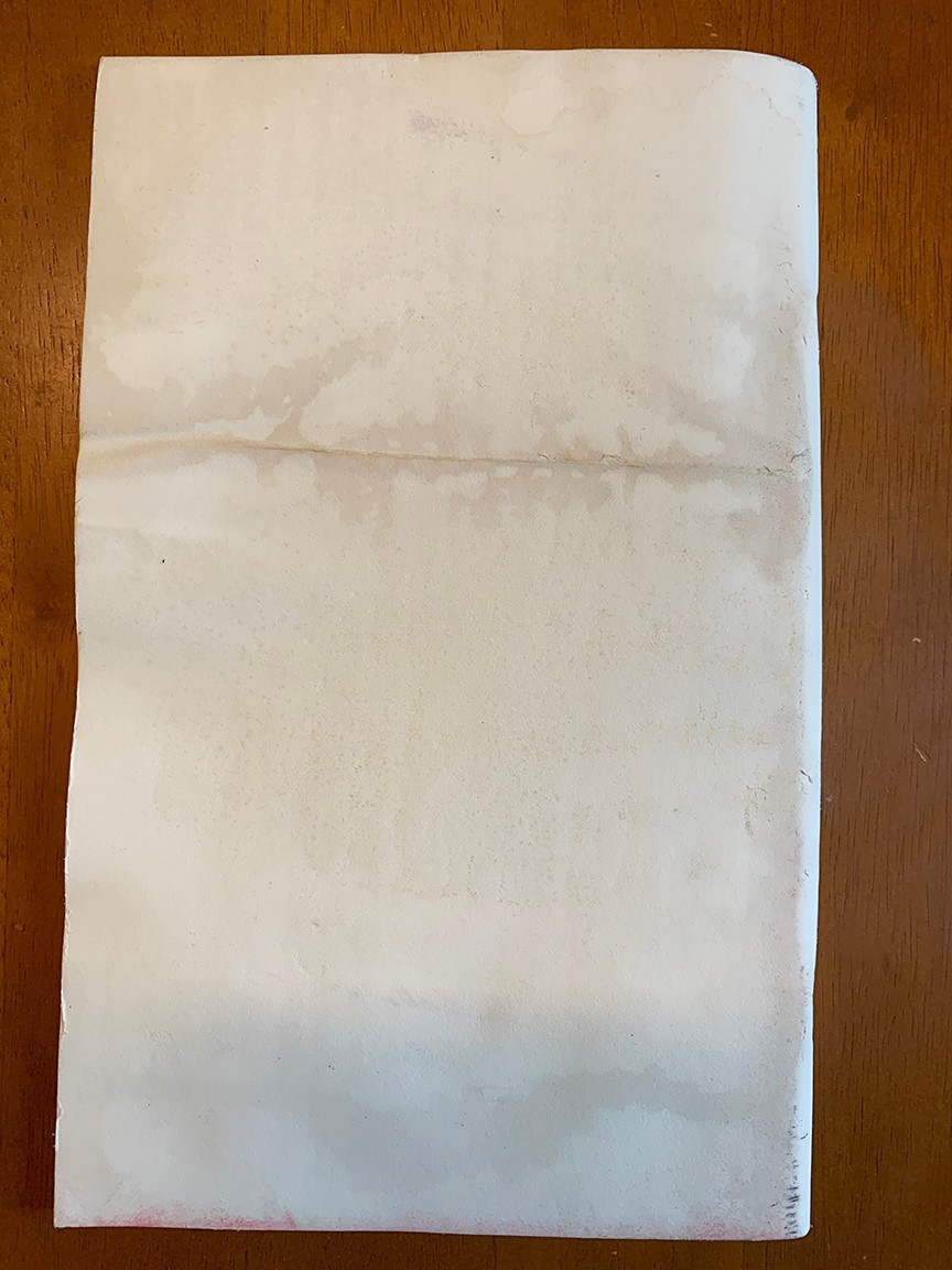 The paper is a bit warped from age. There is a bit of sticky stuff on the top right corner of cover. The back is dirty and there is a water mark inside the front cover. (see images)