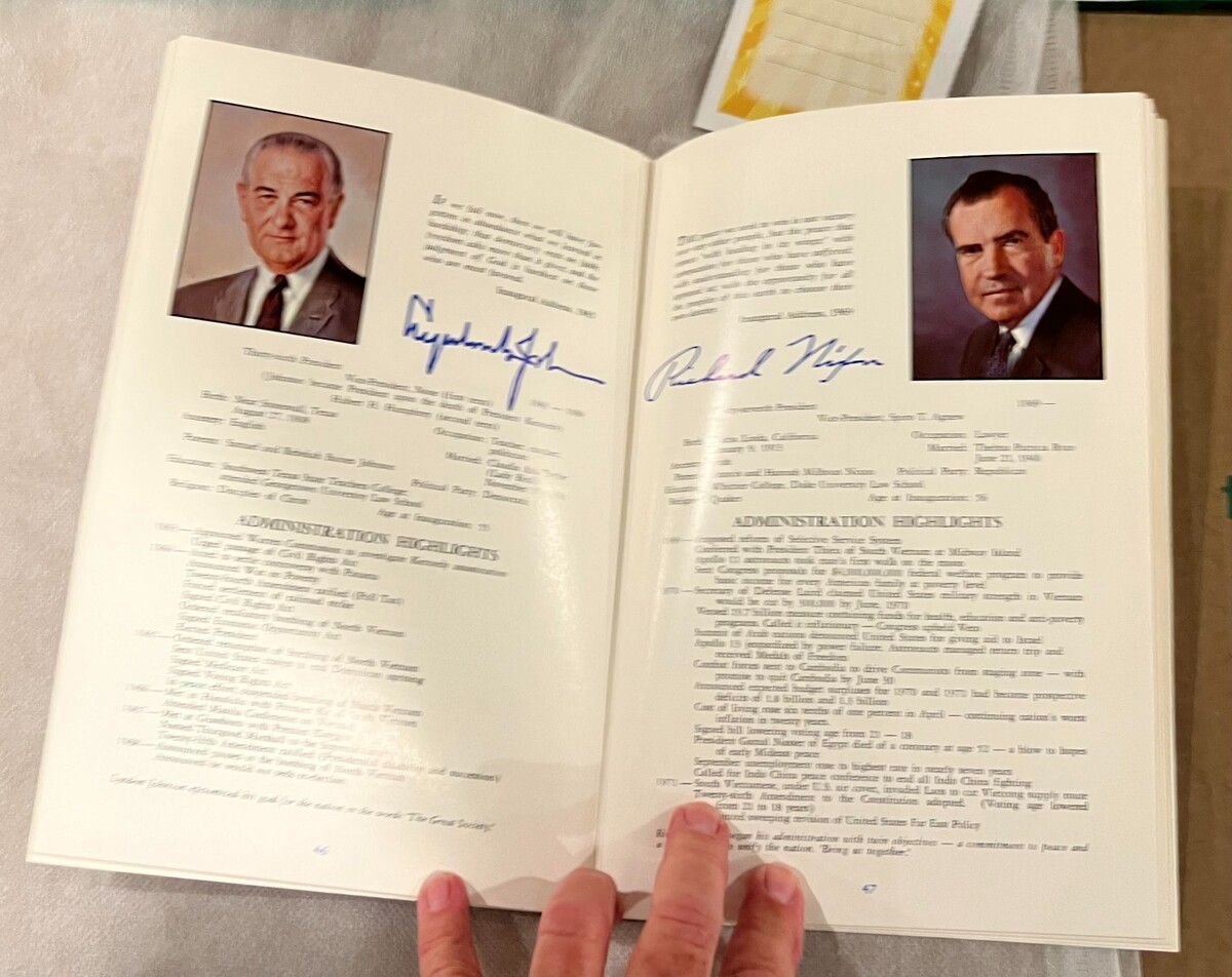 This product is a book titled "PRESIDENTS OF THE UNITED STATES" by First Federal Savings-Worcester MA, published in 1971. While it does not appear to be signed, the book likely contains historical memorabilia and collectibles related to US politics, specifically focusing on the presidency of Lyndon B. Johnson. The product is a valuable piece for collectors or those interested in US political history, offering a unique perspective on the country's past leaders and their contributions.