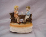 DESCRIPTION: This is a porcelain music box with a boy and girl seated at a table praying. There is a candle on the table between them. The music box works and it turns as the music plays. I do not recognize the song that is being played. The disc used to wind up the music box says Sankyo Japan. The original Price Imports sticker is on the bottom of the music box under the winding disc.