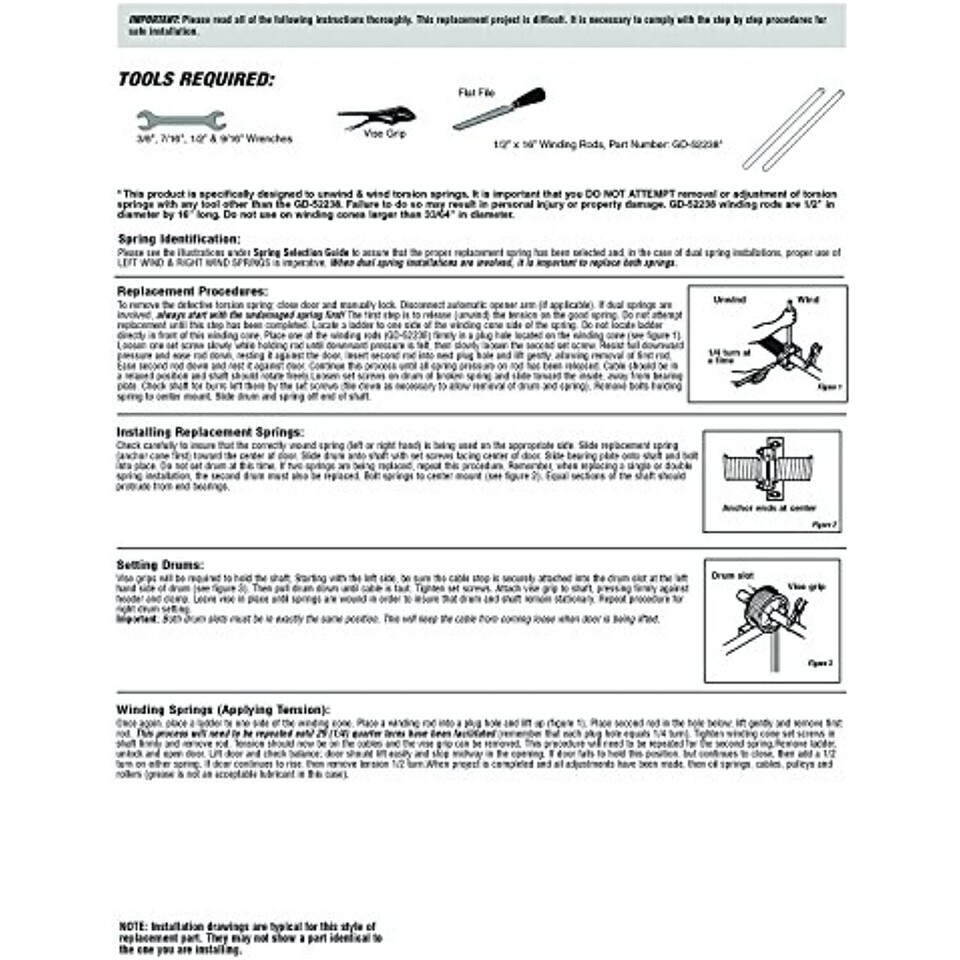 Product Description Use this steel left-hand wound torsion spring to replace broken garage door springs of matching dimensions. It includes mounted stationary and winding cones with .243? wire size x 1-3/4? inside dimension x 32? length with red color code. This torsion spring is a regular duty spring with an estimated lifetime rating of 10,000 cycles. These types of torsion springs provide lifting force for heavy garage doors and must be selected by the spring?s dimensions, rather than the door?s weight. See the product specifications with illustrations found in Prime-Line?s Torsion Spring Selection Guide to ensure that the proper replacement spring has been selected. As an important safety precaution: all broken or malfunctioning hardware should be replaced with matching hardware, without any modifications. These garage door torsion springs can cause serious injury if not handled and installed properly. If attempting to replace the torsion springs yourself, it is important that the removal or adjustment of torsion springs is not attempted with any other tool other than Prime-Line?s item number GD-52238. Failure to utilize Prime-Line?s item number GD-52238 for the replacement of these springs may result in severe personal injury. These winding rods are used to wind and unwind the tension on torsion springs and they are the only tools recommended for this purpose. Two winding rods are required for torsion spring replacement. When dual spring installations are involved, it is important to correctly install both the left and right-wind springs during the same job. In the case of dual spring installations, note that proper use of LEFT-WIND and RIGHT-WIND springs is imperative. When dual spring installations are involved and only one breaks, it is important to replace both springs, as replacing only one spring may add increased strain to the older non-replaced spring. Note: To determine the handing of your torsion spring wind, look at the end of the spring with the ?finger? of the spring at the top of the wind. When the end of the spring is at 12:00 o'clock and it is pointing to the left, the spring is a right wind; if the end of the spring points to right (positioned at 12:00 o'clock) it is a left wind. When standing inside the garage looking outside, the torsion spring with the black painted winding cone installs on the right side of the door, and the torsion spring with the red painted winding cone installs on the left side of the door. From the Manufacturer This torsion spring is constructed of steel and it includes a stationary cone and a winding cone attached to opposite ends of the spring. These types of torsion springs provide lifting force for heavy garage doors and must be selected by the spring?s dimensions, rather than the door?s weight. See the product specifications with illustrations found in Prime-Line?s Torsion Spring Selection Guide to assure that the proper replacement spring has been selected. In the case of dual spring installations, note that the proper use of LEFT WIND RIGHT WIND springs is imperative. Also, when dual spring installations are involved, it is important to replace both springs, as replacing only 1 spring may add increased strain to the older non-replaced spring. This torsion spring is a regular duty spring with an estimated lifetime rating of 10,000 cycles. As an important safety precaution: all broken or malfunctioning hardware should be replaced with matching hardware, without any modifications. These garage door torsion springs can cause serious injury if not handled and installed properly. If attempting to replace the torsion springs yourself, it is important that the removal or adjustment of torsion springs is not attempted with any other tool other than Prime-Line?s item number GD-52238. Failure to utilize Prime-Line?s item number GD-52238 for the replacement of these springs may result in severe personal injury. These winding rods are used to wind and unwind the tension