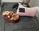 Add rustic charm to your home with this hand-sewn primitive Americana sheep shelf sitter. Made with distressed muslin, red ticking stripes, and a navy star flag patch, this piece is perfect for primitive, patriotic, and farmhouse decor.