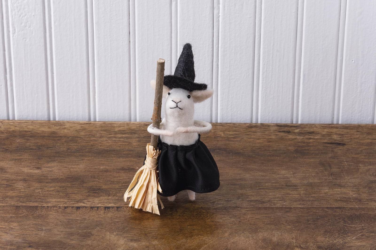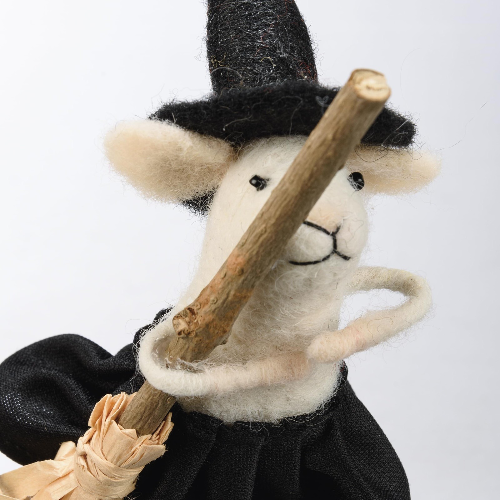 A felt critter featuring a mouse dressed as a witch with dress, witch hat, and